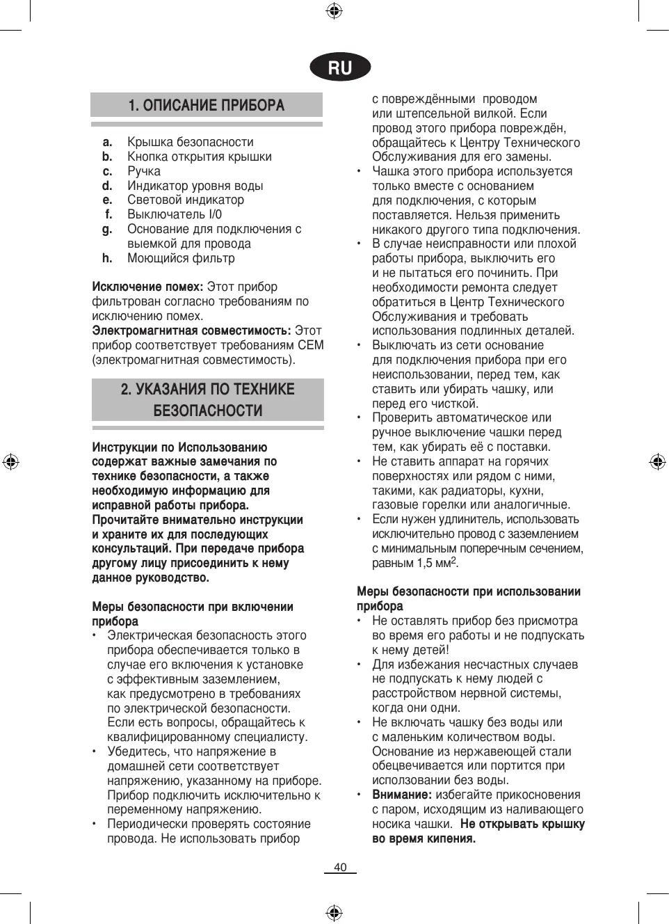 с повреждёнными проводом или штепсельной вилкой. Если провод этого прибора повреждён, обращайтесь к Центру Технического Обслуживания для его замены. Чашка этого прибора используется только вместе с основанием для подключения, с которым поставляется. Нельзя применить никакого другого типа подключения. В случае неисправности или плохой работы прибора, выключить его и не пытаться его починить. При необходимости ремонта следует обратиться в Центр Технического Обслуживания и требовать использования подлинных деталей. Выключать из сети основание для подключения прибора при его неиспользовании, перед тем, как ставить или убирать чашку, или перед его чисткой. Проверить автоматическое или ручное выключение чашки перед тем, как убирать её с поставки. Не ставить аппарат на горячих поверхностях или рядом с ними, такими, как радиаторы, кухни, газовые горелки или аналогичные. Если нужен удлинитель, использовать исключительно провод с заземлением с минимальным поперечным сечением, равным 1,5 мм2. Меры безопасности при использовании