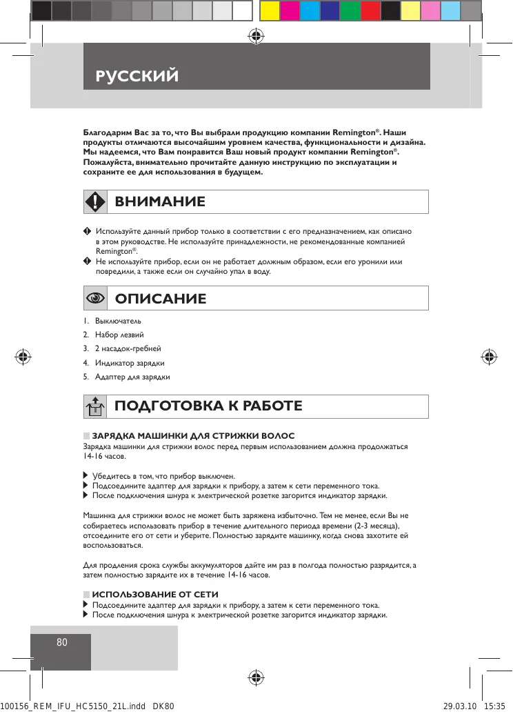 РУКОВОДСТВО ПОЛЬЗОВАТЕЛЯ HC5950 REMINGTON