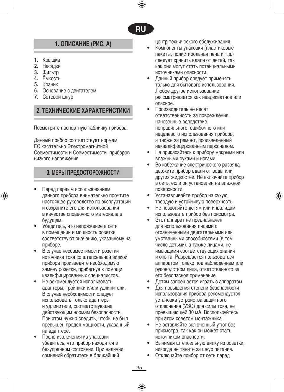 центр технического обслуживания. Компоненты упаковки (пластиковые пакеты, полистирольная пена и т.д.) следует хранить вдали от детей, так как они могут стать потенциальными источниками опасности. Данный прибор следует применять только для бытового использования. Любое другое использование рассматривается как неадекватное или опасное. Производитель не несет ответственности за повреждения, нанесенные вследствие неправильного, ошибочного или нецелевого использования прибора, а также за ремонт, произведенный неквалифицированным персоналом. Не прикасайтесь к прибору мокрыми или влажными руками и ногами. Во избежание электрического разряда держите прибор вдали от воды или других жидкостей. Не включайте прибор в сеть, если он установлен на влажной поверхности. Устанавливайте прибор на сухую, твердую и устойчивую поверхность. Не позволяйте детям или инвалидам использовать прибор без присмотра. Этот аппарат не предназначен для использования лицами с ограниченными двигательными или умственными способностями (в том числе детьми), а также лицами, не имеющими соответствующих знаний и опыта. Разрешается пользоваться аппаратом только под наблюдением или руководством лица, ответственного за его безопасное применение. Детям запрещается играть с аппаратом. Для повышения степени безопасности использования прибора рекомендуется установка устройства защитного отключения (УЗО) для силы тока, не превышающей 30 мА. Воспользуйтесь при этом советом монтажника. Не оставляйте включенный утюг без присмотра, так как он может стать источником опасности. Вынимая штепсельную вилку из розетки, никогда не тяните за шнур питания. Отключайте прибор от сети перед