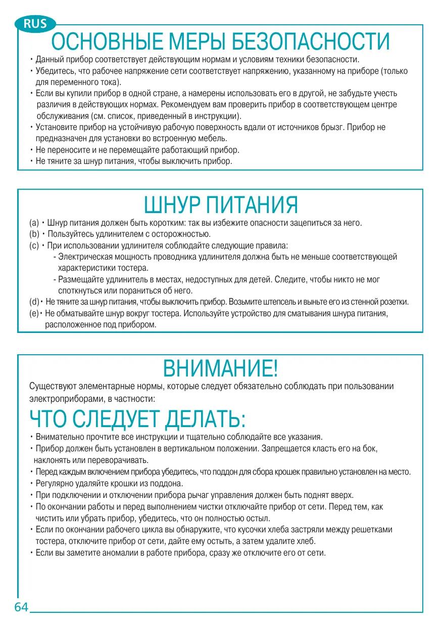- Не тяните за шнур питания, чтобы выключить прибор. ШНУР ПИТАНИЯ (a) • Шнур питания должен быть коротким: так вы избежите опасности зацепиться за него. (b) • Пользуйтесь удлинителем с осторожностью. (c) • При использовании удлинителя соблюдайте следующие правила: - Электрическая мощность проводника удлинителя должна быть не меньше соответствующей характеристики тостера. - Размещайте удлинитель в местах, недоступных для детей. Следите, чтобы никто не мог споткнуться или пораниться об него. (d)• Не тяните за шнур питания, чтобы выключить прибор. Возьмите штепсель и выньте его из стенной розетки. (e)• Не обматывайте шнур вокруг тостера. Используйте устройство для сматывания шнура питания, расположенное под прибором.