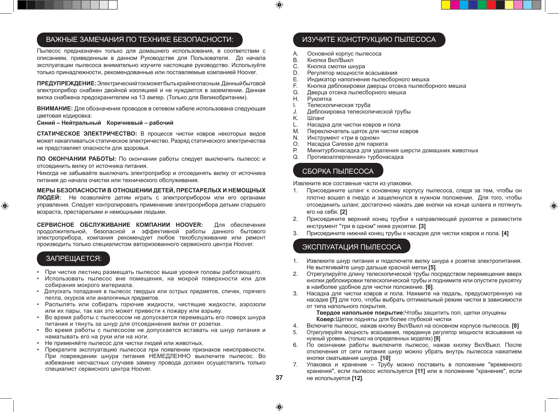 Важные замечания по технике безопасности: Изучите конструкцию пылесоса Пылесос предназначен только для домашнего использования, в соответствии с описанием, приведенным в данном Руководстве для Пользователя. До начала эксплуатации пылесоса внимательно изучите настоящее руководство. Используйте только принадлежности, рекомендованные или поставляемые компанией Hoover.