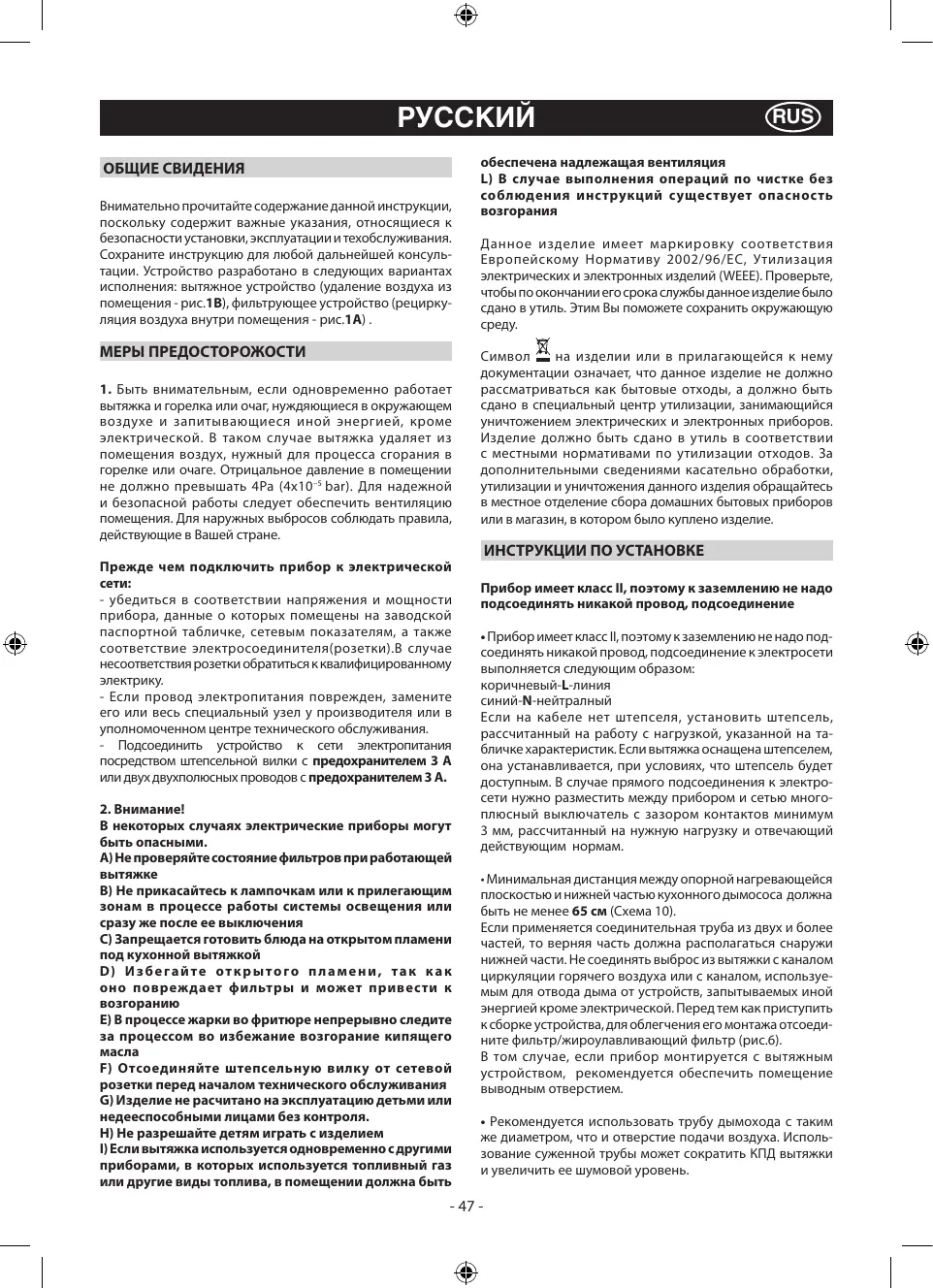 1. Attention, lorsque dans la même pièce vous utilisez simultanément la hotte à évacuation avec un brûleur ou une cheminée alimentés par une énergie autre que l’électricité, vous pouvez créer un problème “d’inversion de flux”. Dans ce cas la hotte aspire l’air nécessaire à leur combustion. La dépression dans le local ne doit pas dépasser les 4 Pa (4x10-5 bar). Pour un fonctionnement en toute sécurité, n’oubliez pas de prévoir une ventilation suffisante du local. Pour l’évacuation vers l’extérieur, veuillez vous référer aux dispositions en vigueur dans votre pays.