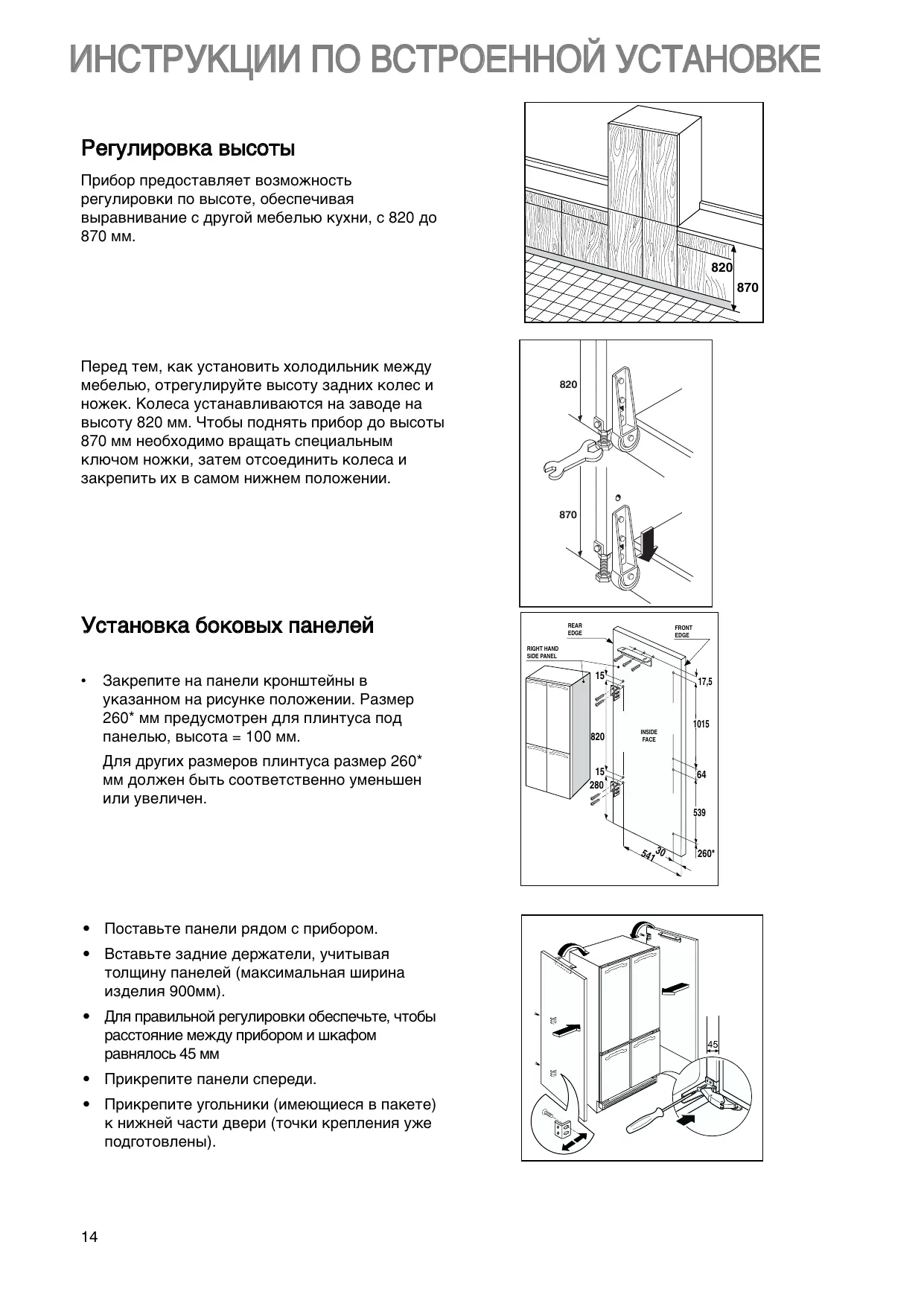 • Поставьте панели рядом с прибором. • Вставьте задние держатели, учитывая толщину панелей (максимальная ширина изделия 900мм). • Для правильной регулировки обеспечьте, чтобы расстояние между прибором и шкафом равнялось 45 мм • èÓ‚ÂËÚ¸ ‚˚‡‚ÌË‚‡ÌË ‰‚ÂÂÈ, • Прикрепите панели спереди. ‚Ûfl • ‚‡ Прикрепите Ë ÔÂÚÎË. угольники (имеющиеся в пакете) к нижней части двери (точки крепления уже подготовлены).