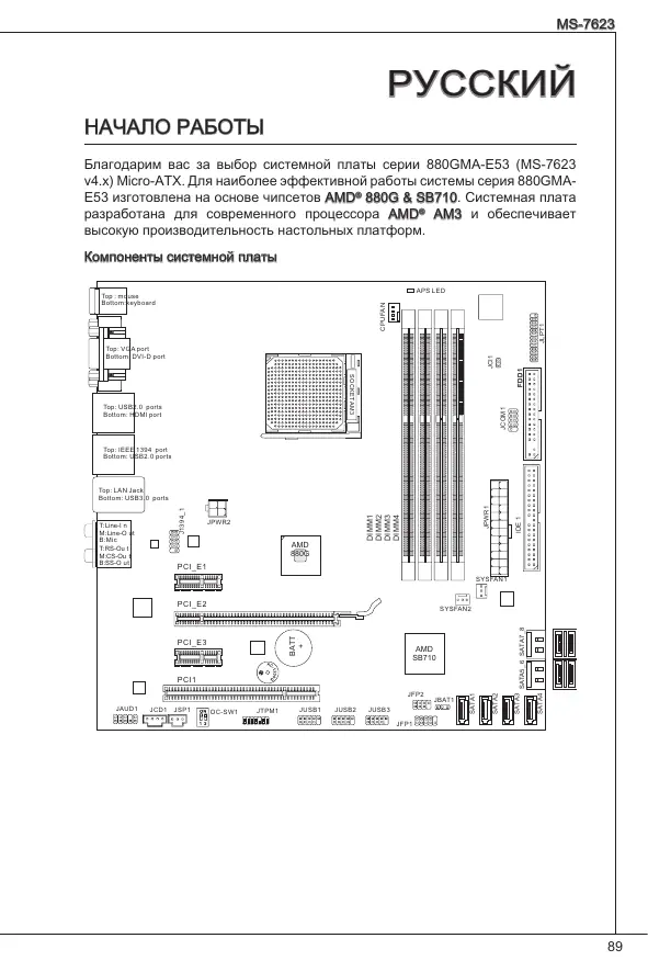 НАЧАЛО РАБОТЫ Благодарим вас за выбор системной платы серии 880GMA-E53 (MS-7623 v4.x) Micro-ATX. Для наиболее эффективной работы системы серия 880GMAE53 изготовлена на основе чипсетов AMD® 880G & SB710. Системная плата разработана для современного процессора AMD® AM3 и обеспечивает высокую производительность настольных платформ. Компоненты системной платы APS LED JLPT1 CPUFAN Top : mouse Bottom:keyboard JCOM1 SOCKET AM3 Top: USB2.0 ports Bottom: HDMI port FDD1 JCI1 Top: VGA port Bottom: DVI-D port Top: IEEE 1394 port Bottom: USB2.0 ports JPWR1 JPWR2 AMD 880G IDE 1 T: Line-I n M: Line-O ut B: Mic T:RS-Ou t M:CS-Ou t B:SS-O ut DIMM1 DIMM2 DIMM3 DIMM4 J1394_1 Top: LAN Jack Bottom: USB3.0 ports PCI_E1 SYSFAN1 PCI_E2 SATA5_6 SATA7_8 AMD SB710 JCD1 JSP1 OC-SW1 JTPM1 JUSB1 JUSB2 JUSB3 JBAT1 SATA2 JFP2 JAUD1 SATA1 PCI1 SATA4 PCI_E3 SATA3 BATT