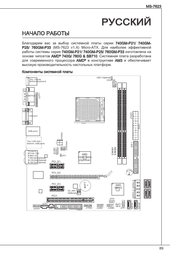 начало работы Благодарим вас за выбор системной платы серии 740GM-P21/ 740GMP25/ 760GM-P33 (MS-7623 v1.X) Micro-ATX. Для наиболее эффективной работы системы серия 740GM-P21/ 740GM-P25/ 760GM-P33 изготовлена на основе чипсетов AMD® 740G/ 760G & SB710. Системная плата разработана для современного процессора AMD® в конструктиве AM3 и обеспечивает высокую производительность настольных платформ. Компоненты системной платы LED1 (Optional) CPUFAN T:Line-In M:Line- Out B:MIC-Int T: RS-Out (Optional) M: CS-Out (Optional) B: SS-Out (Optional) JCOM1 AMD 740G/ 760G (Optional) JCI1 PCI_E1 IDE 1 Top: LAN Jack Bottom: USB ports SYSFAN1 JPWR2 USB ports JPWR1 SOCKET AM3 VGA port DIMM1 DIMM2 COM Port JLPT1 Top : mouse Bottom:keyboard AMD SB710