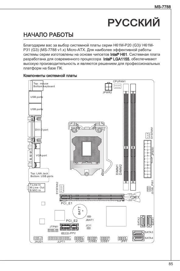 НАЧАЛО РАБОТЫ Благодарим вас за выбор системной платы серии H61M-P20 (G3)/ H61MP31 (G3) (MS-7788 v1.x) Micro-ATX. Для наиболее эффективной работы системы серии изготовлены на основе чипсетов Intel® H61. Системная плата разработана для современного процессора Intel® LGA1155, обеспечивают высокую производительность и являются решением для профессиональных платформ на базе ПК. Компоненты системной платы CPUFAN1 Top : mouse Bottom:keyboard JPWR2 USB ports SYSFAN1 USB ports JPWR1 DVI-D port DIMM1 DIMM2 VGA port SYSFAN2 T:Line-In M:Line- Out B:MIC-In JUSB_PW1 Top: LAN Jack Bottom: USB ports JBAT1 JCI1 JTPM1 SATA3 JFP2 JAUD1 JLPT1 JCOM1 SATA1 PCI_E2 SATA2 BATT