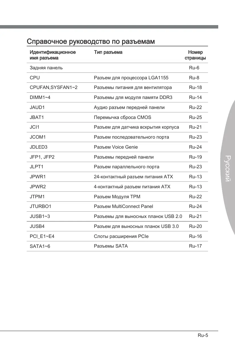 JUSB4 JBAT1 PCI_E1 JCI1 PCI_E2 SATA1/ 2 JCOM1 PCI_E3 SATA3/ 4 JTPM1 PCI_E4 SATA5/ 6 JFP1 JAUD1 JFP2 JLPT1 JUSB1/ 2/ 3 JDLED3 Ru-4 Справочное руководство по разъемам Идентификационное имя разъема Тип разъема Задняя панель