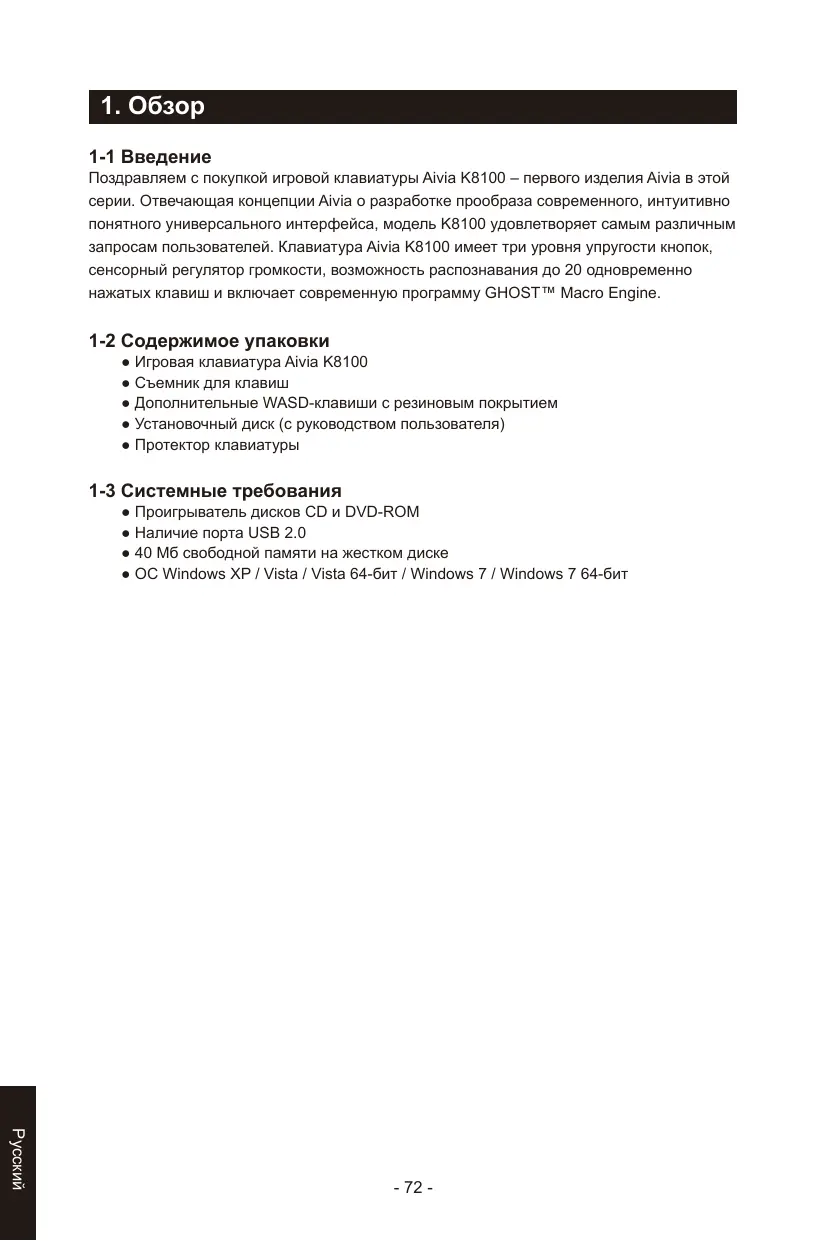 Поздравляем с покупкой игровой клавиатуры Aivia K8100 – первого изделия Aivia в этой серии. Отвечающая концепции Aivia о разработке прообраза современного, интуитивно понятного универсального интерфейса, модель K8100 удовлетворяет самым различным запросам пользователей. Клавиатура Aivia K8100 имеет три уровня упругости кнопок, сенсорный регулятор громкости, возможность распознавания до 20 одновременно нажатых клавиш и включает современную программу GHOST™ Macro Engine.