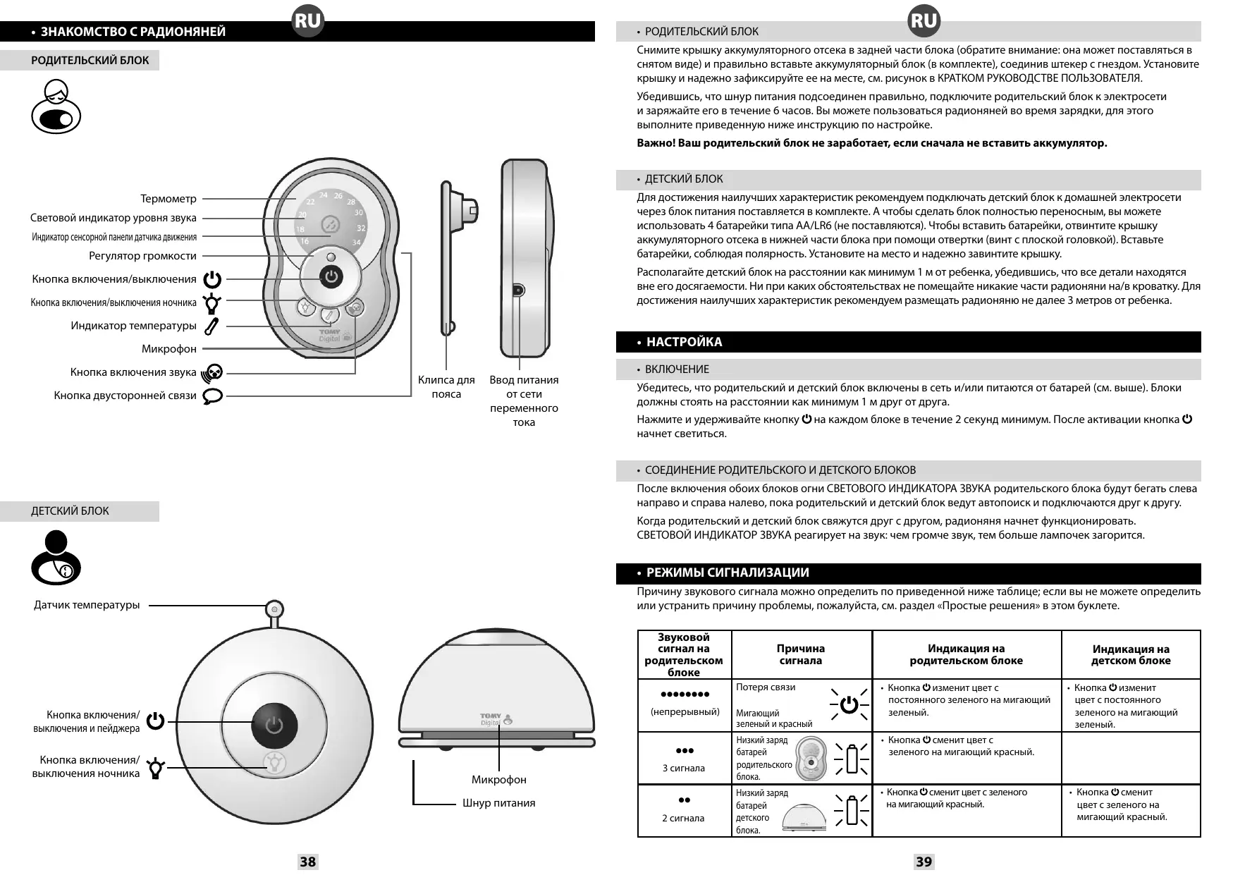 Увеличьте громкость на родительском блоке. Убедитесь в наличии питания обоих блоков, затем выполните действия, описанные в разделе “Настройка” этого буклета. Родительский блок издает Недостаточное питание от батареи двойной сигнал примерно одного или двух блоков. каждую минуту. Определите севшую батарею и зарядите или замените батареи или подключите прибор к электросети. Высокочастотный шум. Блоки расположены слишком близко друг к другу. Разнесите блоки друг от друга. Слишком высокий уровень громкости. Уменьшите громкость.