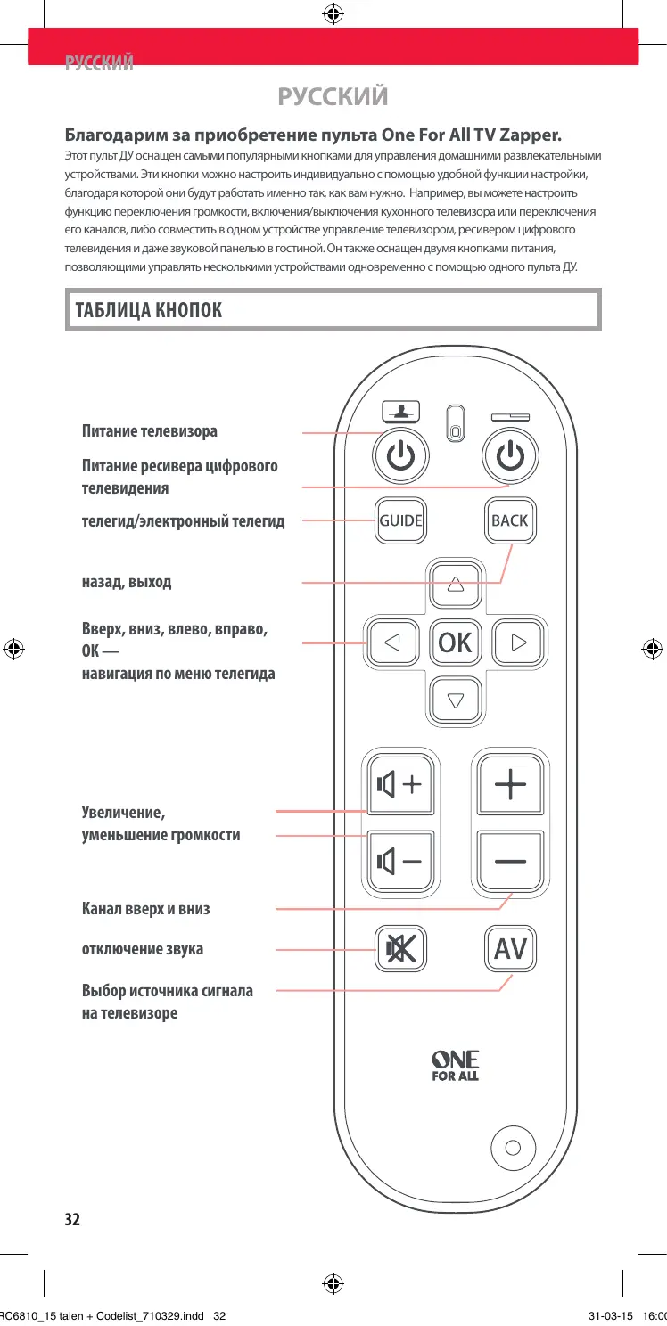 URC6810 - Универсальный пульт ONE FOR ALL - Бесплатное руководство пользователя