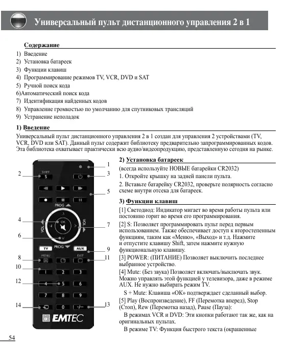 Универсальный пульт дистанционного управления 2 в 1 создан для управления 2 устройствами (TV, VCR, DVD или SAT). Данный пульт содержит библиотеку предварительно запрограммированных кодов. Эта библиотека охватывает практически всю аудио/видеопродукцию, представленную сегодня на рынке.
