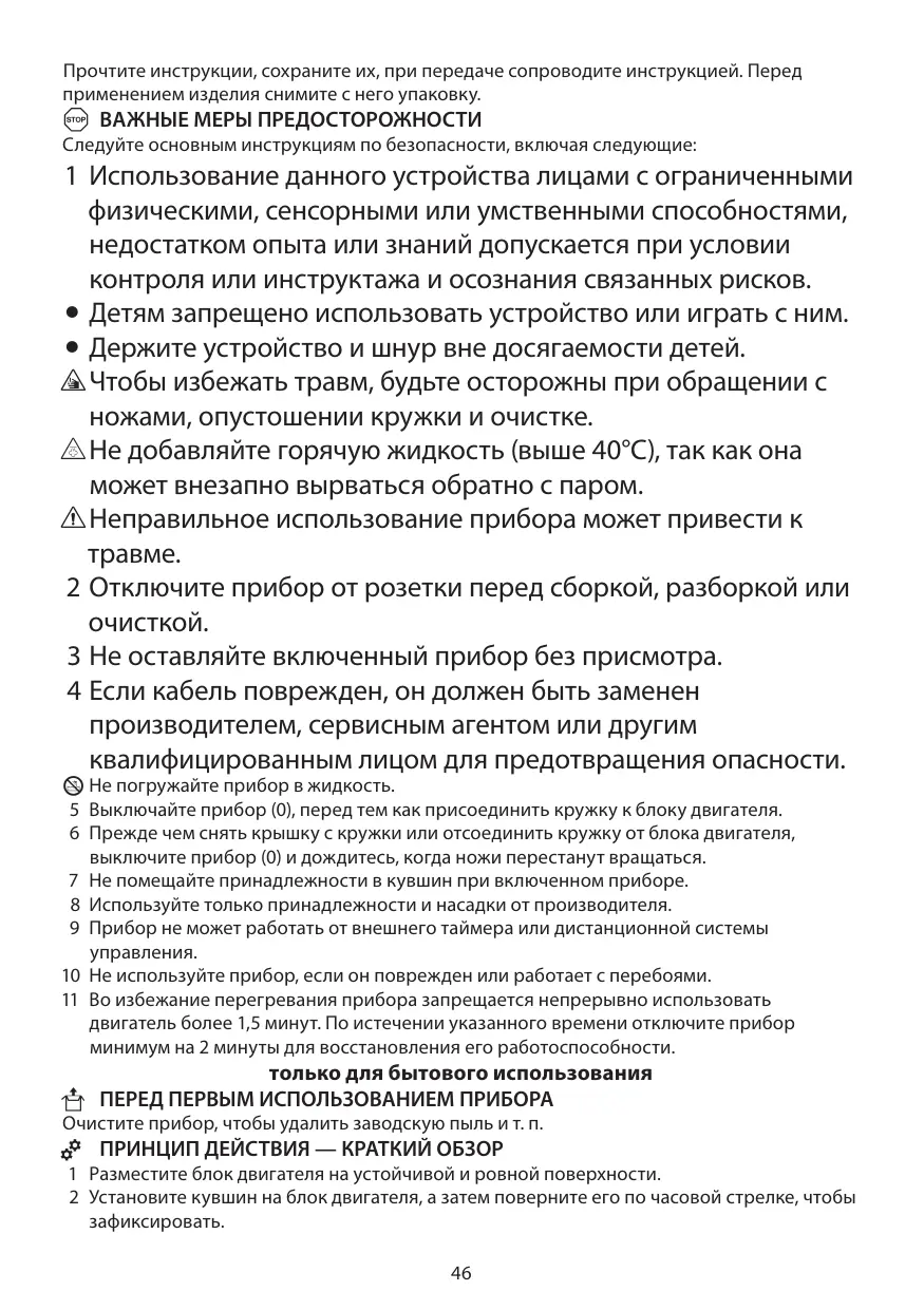 1 Использование данного устройства лицами с ограниченными физическими, сенсорными или умственными способностями, недостатком опыта или знаний допускается при условии контроля или инструктажа и осознания связанных рисков. • Детям запрещено использовать устройство или играть с ним. • Держите устройство и шнур вне досягаемости детей. s Чтобы избежать травм, будьте осторожны при обращении с ножами, опустошении кружки и очистке. u Не добавляйте горячую жидкость (выше 40°C), так как она может внезапно вырваться обратно с паром. c Неправильное использование прибора может привести к травме. 2 Отключите прибор от розетки перед сборкой, разборкой или очисткой. 3 Не оставляйте включенный прибор без присмотра. 4 Если кабель поврежден, он должен быть заменен производителем, сервисным агентом или другим квалифицированным лицом для предотвращения опасности.