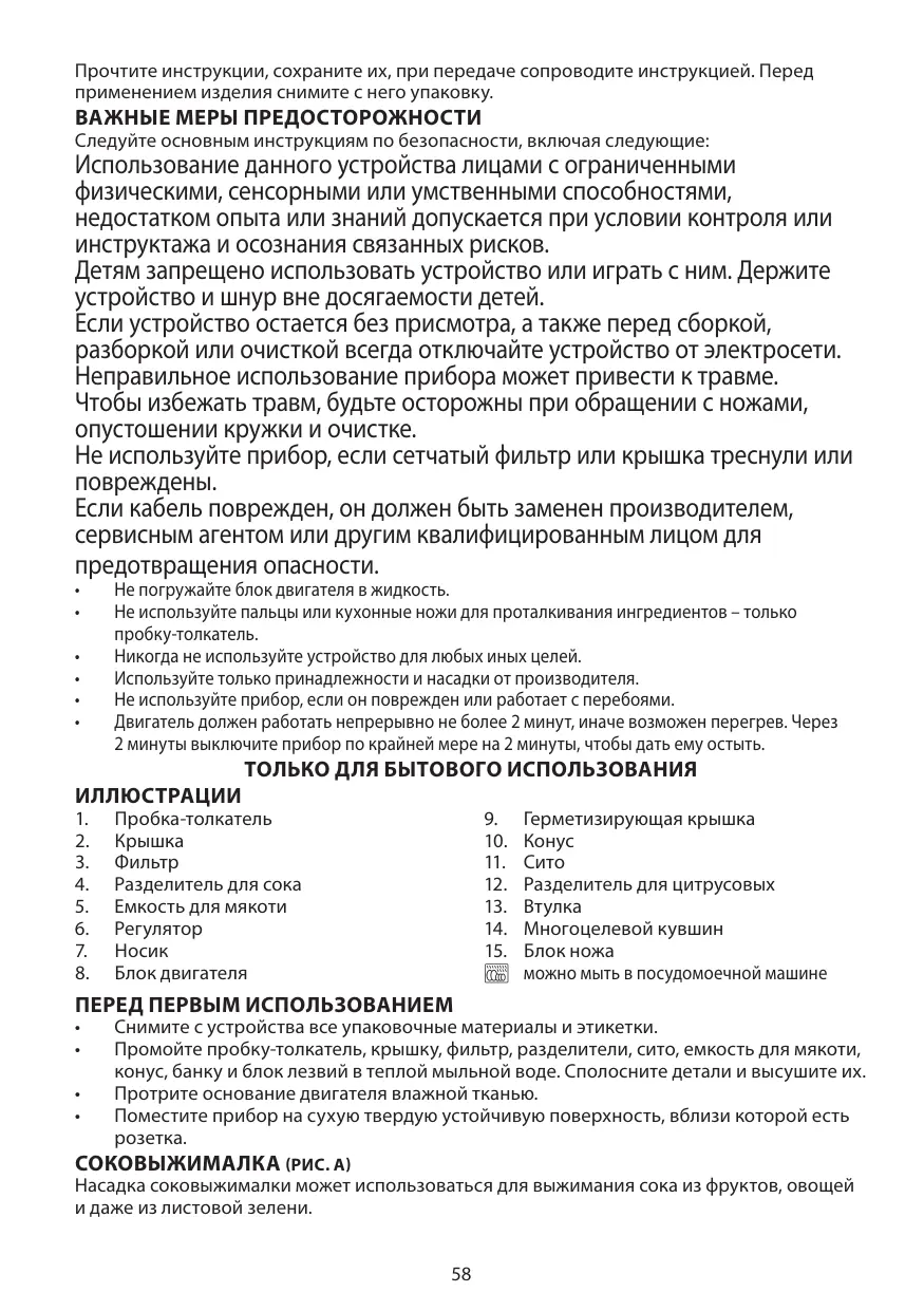 Lavez l’élément poussoir, le couvercle, le tamis, les séparateurs, le filtre, le collecteur de pulpe, le cône, la carafe et le set de lames dans de de l’eau chaude savonneuse. Rincez et séchez ces éléments.