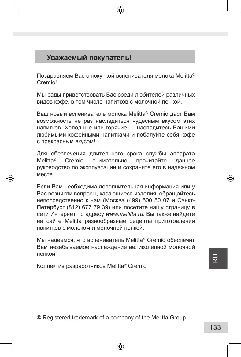 РУКОВОДСТВО ПОЛЬЗОВАТЕЛЯ CREMIO 100501 MELITTA