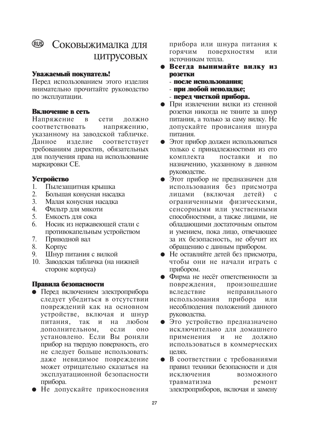 Скачайте инструкцию для вашего Соковыжималки для цитрусов в формате PDF бесплатно! Найдите своё руководство CP 3549 - SEVERIN и возьмите своё электронное устройство обратно в руки. На этой странице опубликованы все документы, необходимые для использования вашего устройства. CP 3549 бренда SEVERIN.