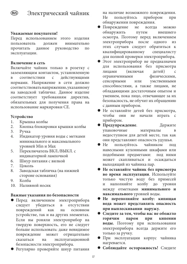 - La bouilloire sera utilisée exclusivement avec le socle fourni. L'appareil doit être utilisé uniquement sur une surface plane, imperméable et résistante.