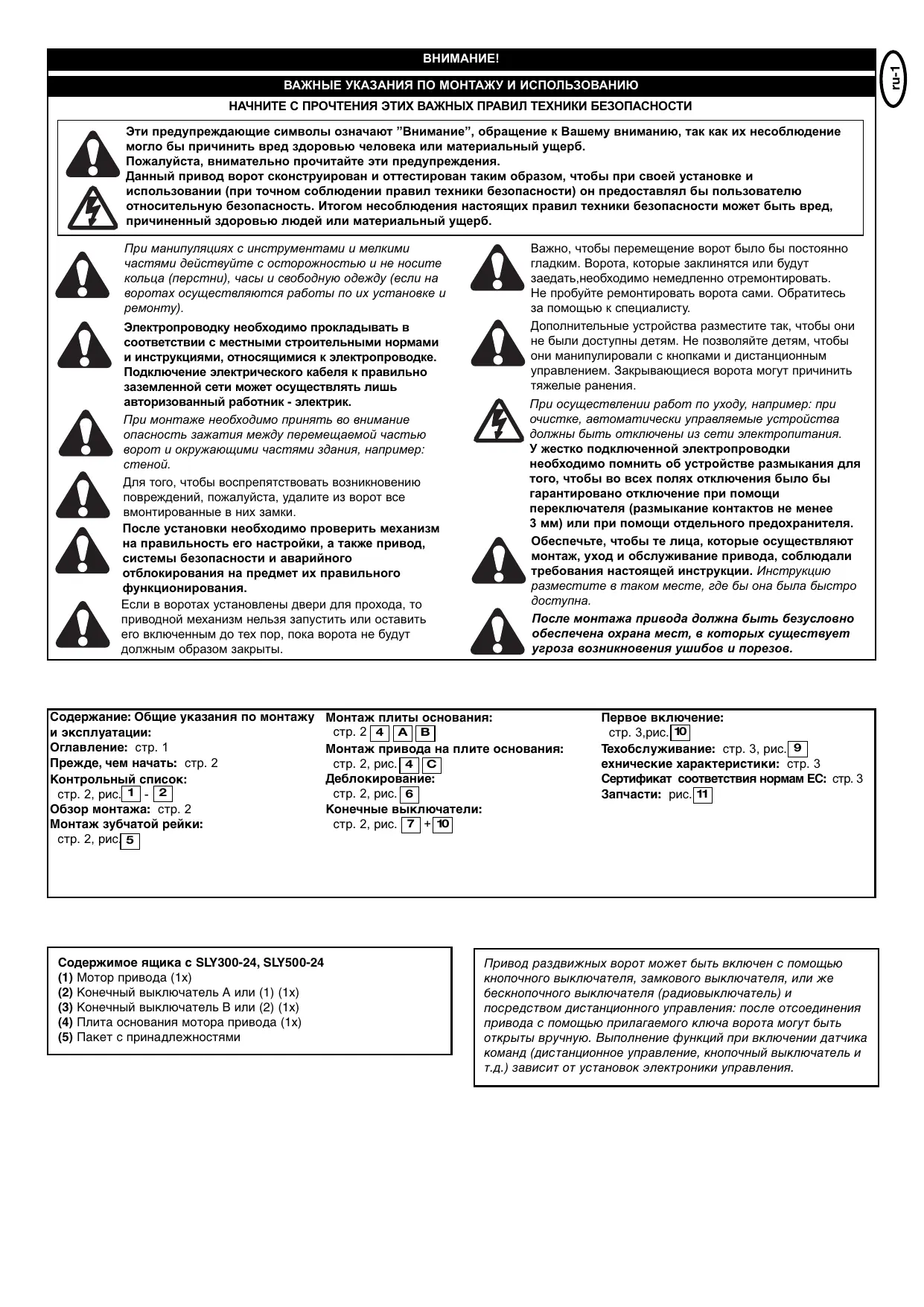 Содержимое ящика с SLY300-24, SLY500-24 (1) Мотор привода (1х) (2) Конечный выключатель А или (1) (1х) (3) Конечный выключатель В или (2) (1х) (4) Плита основания мотора привода (1х) (5) Пакет с принадлежностями