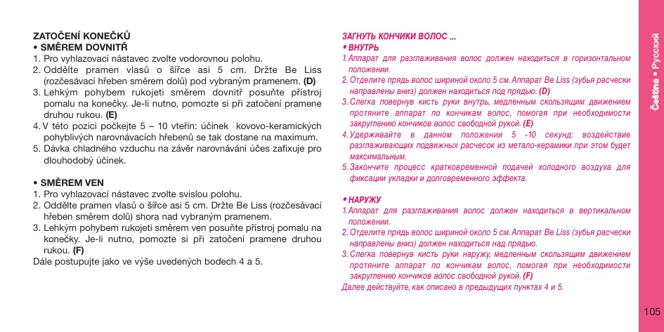 ZATOČENÍ KONEČKŮ • SMĚREM DOVNITŘ 1. Pro vyhlazovací nástavec zvolte vodorovnou polohu. 2. Oddělte pramen vlasů o šířce asi 5 cm. Držte Be Liss (rozčesávací hřeben směrem dolů) pod vybraným pramenem. (D) 3. Lehkým pohybem rukojeti směrem dovnitř posuňte přístroj pomalu na konečky. Je-li nutno, pomozte si při zatočení pramene druhou rukou. (E) 4. V této pozici počkejte 5 – 10 vteřin: účinek kovovo-keramických pohyblivých narovnávacích hřebenů se tak dostane na maximum. 5. Dávka chladného vzduchu na závěr narovnávání účes zafixuje pro dlouhodobý účinek.