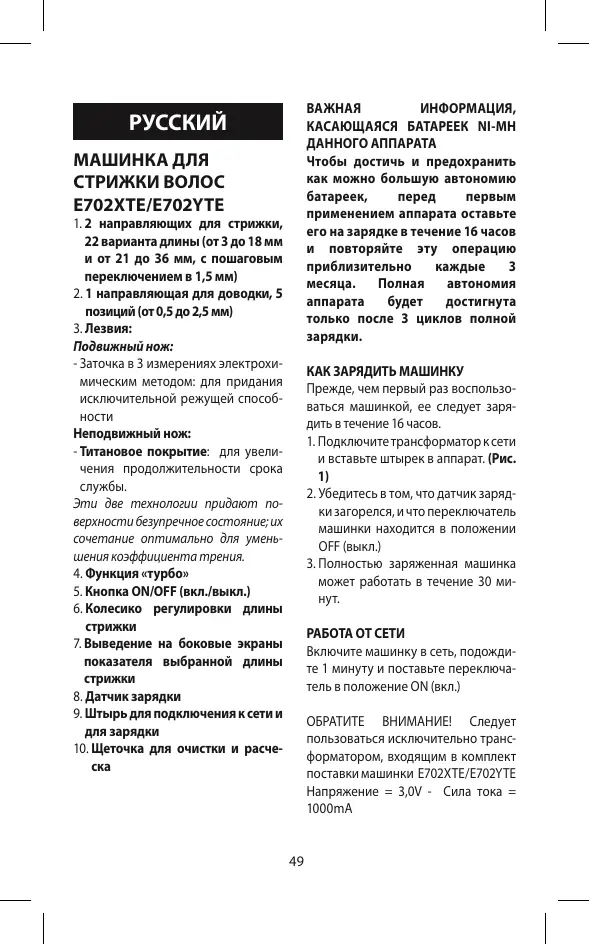 РУКОВОДСТВО ПОЛЬЗОВАТЕЛЯ E702XTE BABYLISS