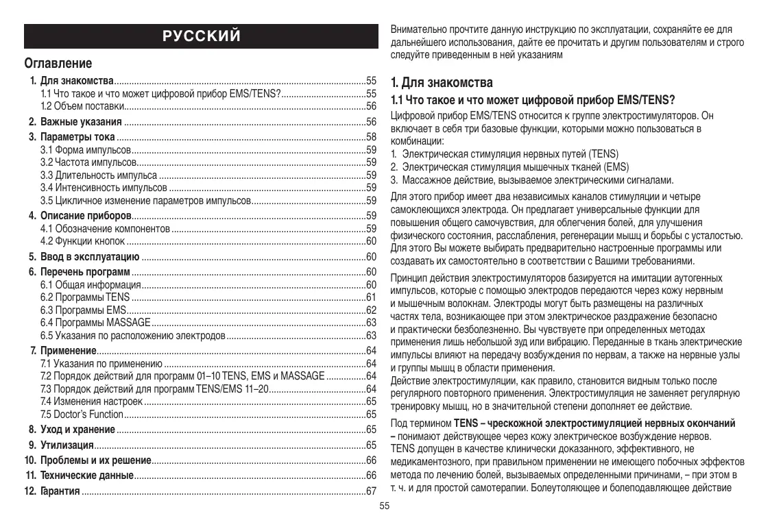 1.1 Что такое и что может цифровой прибор EMS/TENS?...................................55.