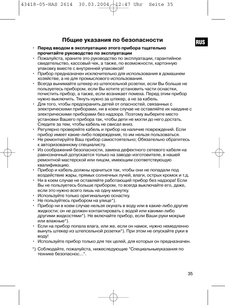 • Перед вводом в эксплуатацию этого прибора тщательно прочитайте руководство по эксплуатации • Пожалуйста, храните это руководство по эксплуатации, гарантийное свидетельство, кассовый чек, а также, по возможности, картонную упаковку вместе с внутренней упаковкой! • Прибор предназначен исключительно для использования в домашнем хозяйстве, а не для промыслового использования. • Всегда вынимайте штекер из штепсельной розетки, если Вы больше не пользуетесь прибором, если Вы хотите установить части оснастки, почистить прибор, а также, если возникает помеха. Перед этим прибор нужно выключить. Тянуть нужно за штекер, а не за кабель. • Для того, чтобы предохранить детей от опасностей, связанных с электрическими приборами, ни в коем случае не оставляйте их наедине с электрическими приборами без надзора. Поэтому выберите место установки Вашего прибора так, чтобы дети не могли до него достать. Следите за тем, чтобы кабель не свисал вниз. • Регулярно проверяйте кабель и прибор на наличие повреждений. Если прибор имеет какие-либо повреждения, то им нельзя пользоваться. • Не ремонтируйте Ваш прибор самостоятельно; Обязательно обратитесь к авторизованному специалисту. • Из соображений безопасности, замена дефектного сетевого кабеля на равнозначный допускается только на заводе-изготовителе, в нашей ремонтной мастерской или лицом, имеющим соответствующую квалификацию. • Прибор и кабель должны храниться так, чтобы они не попадали под воздействие жары, прямых солнечных лучей, влаги, острых кромок и т.д. • Ни в коем случае не оставляйте работающий прибор без надзора! Если Вы не пользуетесь больше прибором, то всегда выключайте его, даже, если это нужно всего лишь на одну минутку. • Используйте только оригинальную оснастку. • Не пользуйтесь прибором на улице*). • Прибор ни в коем случае нельзя окунать в воду или в какие-либо другие жидкости; он не должен контактировать с водой или какими-либо другими жидкостями*). Не включайте прибор, если Ваши руки мокрые или влажные*). • Если на прибор попала влага, или же, если он намок, нужно немедленно вынуть штекер из штепсельной розетки*). При этом не опускайте руки в воду! • Используйте прибор только для тех целей, для которых он предназначен. *) Соблюдайте, пожалуйста, нижеследующие “Специальныеуказания по технике безопаснос...“.