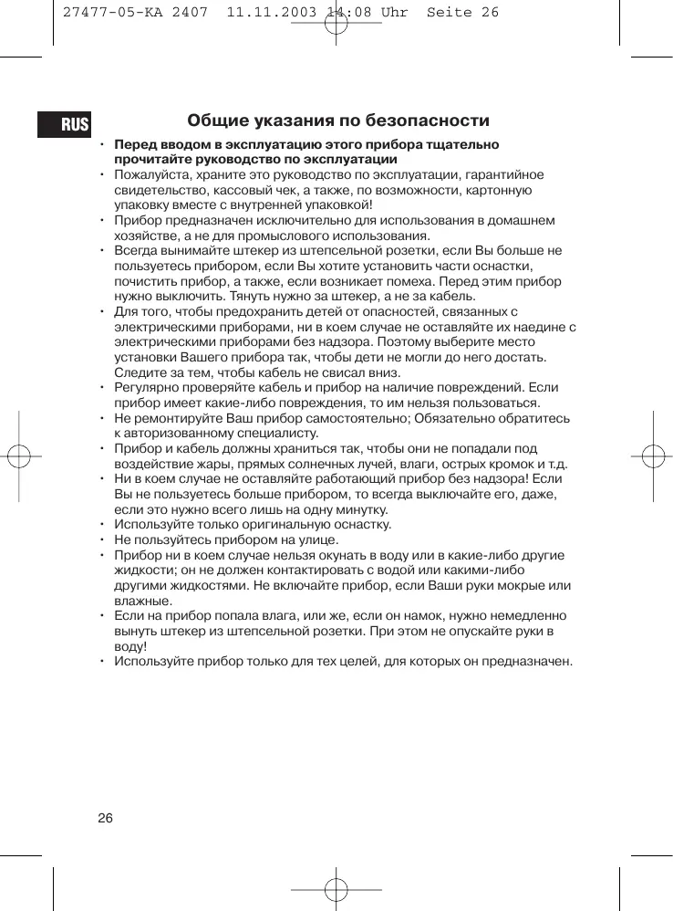 • Перед вводом в эксплуатацию этого прибора тщательно прочитайте руководство по эксплуатации • Пожалуйста, храните это руководство по эксплуатации, гарантийное свидетельство, кассовый чек, а также, по возможности, картонную упаковку вместе с внутренней упаковкой! • Прибор предназначен исключительно для использования в домашнем хозяйстве, а не для промыслового использования. • Всегда вынимайте штекер из штепсельной розетки, если Вы больше не пользуетесь прибором, если Вы хотите установить части оснастки, почистить прибор, а также, если возникает помеха. Перед этим прибор нужно выключить. Тянуть нужно за штекер, а не за кабель. • Для того, чтобы предохранить детей от опасностей, связанных с электрическими приборами, ни в коем случае не оставляйте их наедине с электрическими приборами без надзора. Поэтому выберите место установки Вашего прибора так, чтобы дети не могли до него достать. Следите за тем, чтобы кабель не свисал вниз. • Регулярно проверяйте кабель и прибор на наличие повреждений. Если прибор имеет какие-либо повреждения, то им нельзя пользоваться. • Не ремонтируйте Ваш прибор самостоятельно; Обязательно обратитесь к авторизованному специалисту. • Прибор и кабель должны храниться так, чтобы они не попадали под воздействие жары, прямых солнечных лучей, влаги, острых кромок и т.д. • Ни в коем случае не оставляйте работающий прибор без надзора! Если Вы не пользуетесь больше прибором, то всегда выключайте его, даже, если это нужно всего лишь на одну минутку. • Используйте только оригинальную оснастку. • Не пользуйтесь прибором на улице. • Прибор ни в коем случае нельзя окунать в воду или в какие-либо другие жидкости; он не должен контактировать с водой или какими-либо другими жидкостями. Не включайте прибор, если Ваши руки мокрые или влажные. • Если на прибор попала влага, или же, если он намок, нужно немедленно вынуть штекер из штепсельной розетки. При этом не опускайте руки в воду! • Используйте прибор только для тех целей, для которых он предназначен.