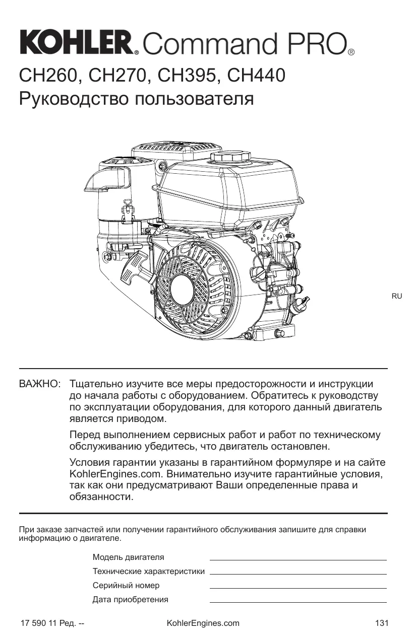 ВАЖНО: Тщательно изучите все меры предосторожности и инструкции до начала работы с оборудованием. Обратитесь к руководству по эксплуатации оборудования, для которого данный двигатель является приводом. Перед выполнением сервисных работ и работ по техническому обслуживанию убедитесь, что двигатель остановлен. Условия гарантии указаны в гарантийном формуляре и на сайте KohlerEngines.com. Внимательно изучите гарантийные условия, так как они предусматривают Ваши определенные права и обязанности. При заказе запчастей или получении гарантийного обслуживания запишите для справки информацию о двигателе. Модель двигателя Технические характеристики Серийный номер Дата приобретения 17 590 11 Ред. -- KohlerEngines.com
