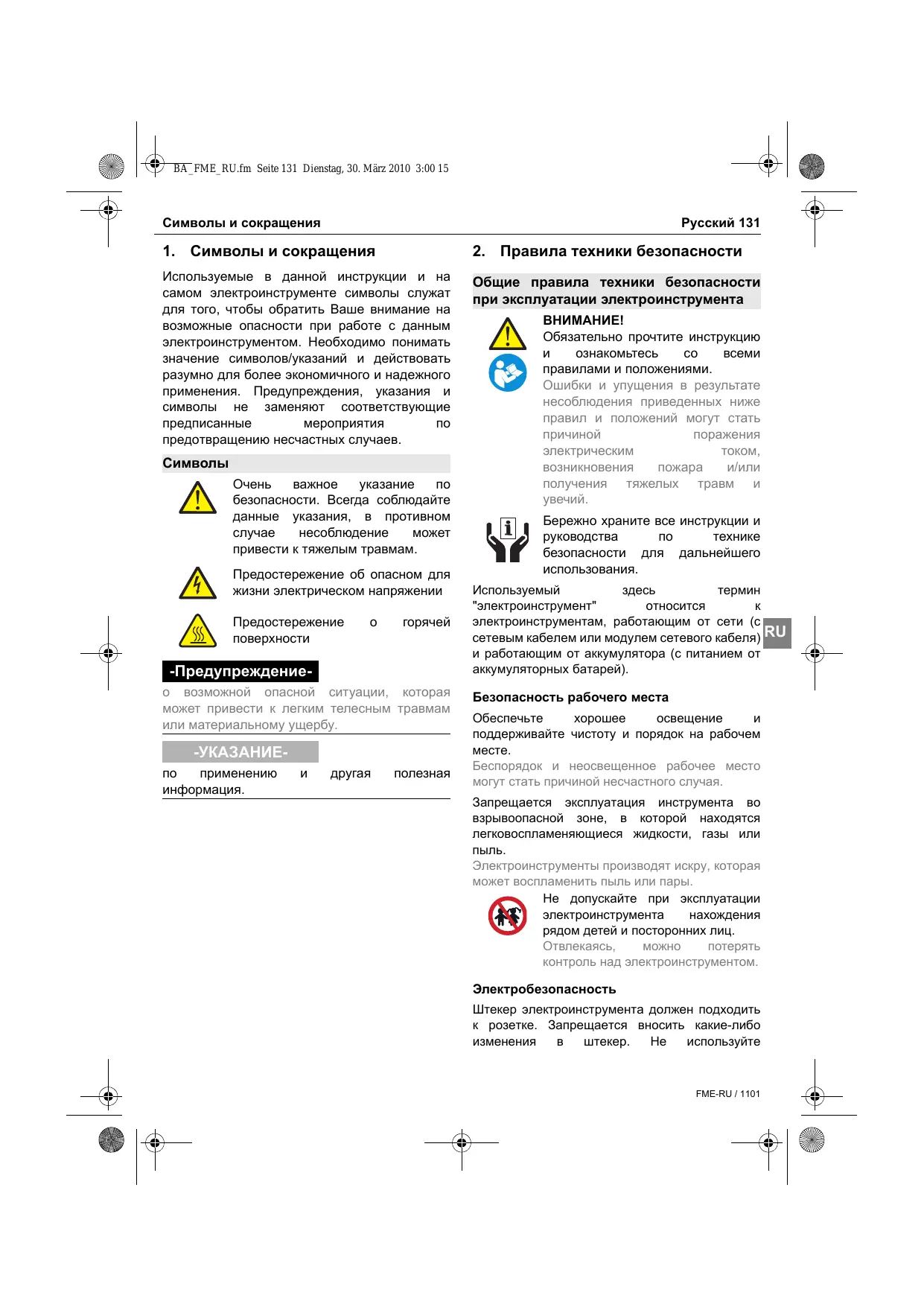электрическим Остаточный риск. Хотя в руководствах по эксплуатации электроинструментов даются подробные инструкции по безопасной эксплуатации электроинструмента, каждый электроинструмент сохраняет определенный остаточный риск, который даже с помощью защитных устройств невозможно полностью исключить. Поэтому всегда эксплуатируйте электроинструменты с соблюдением необходимых мер предосторожности! BA_FME_RU.fm Seite 135 Dienstag, 30. März 2010 3:00 15 Описание машины