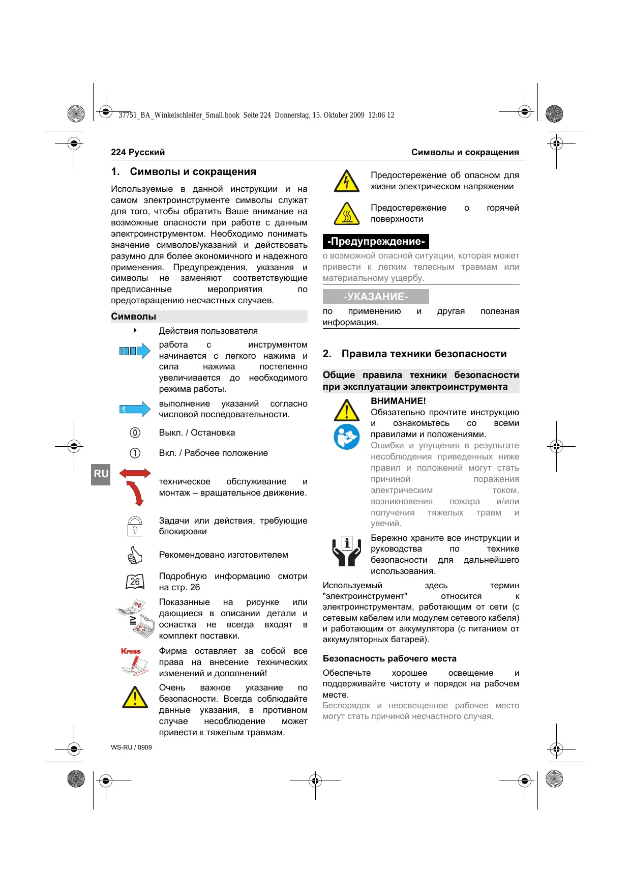 безопасности. Всегда соблюдайте данные указания, в противном несоблюдение привести к тяжелым травмам. WS-RU / 0909 Символы и сокращения Предостережение об опасном для жизни электрическом напряжении Предостережение поверхности