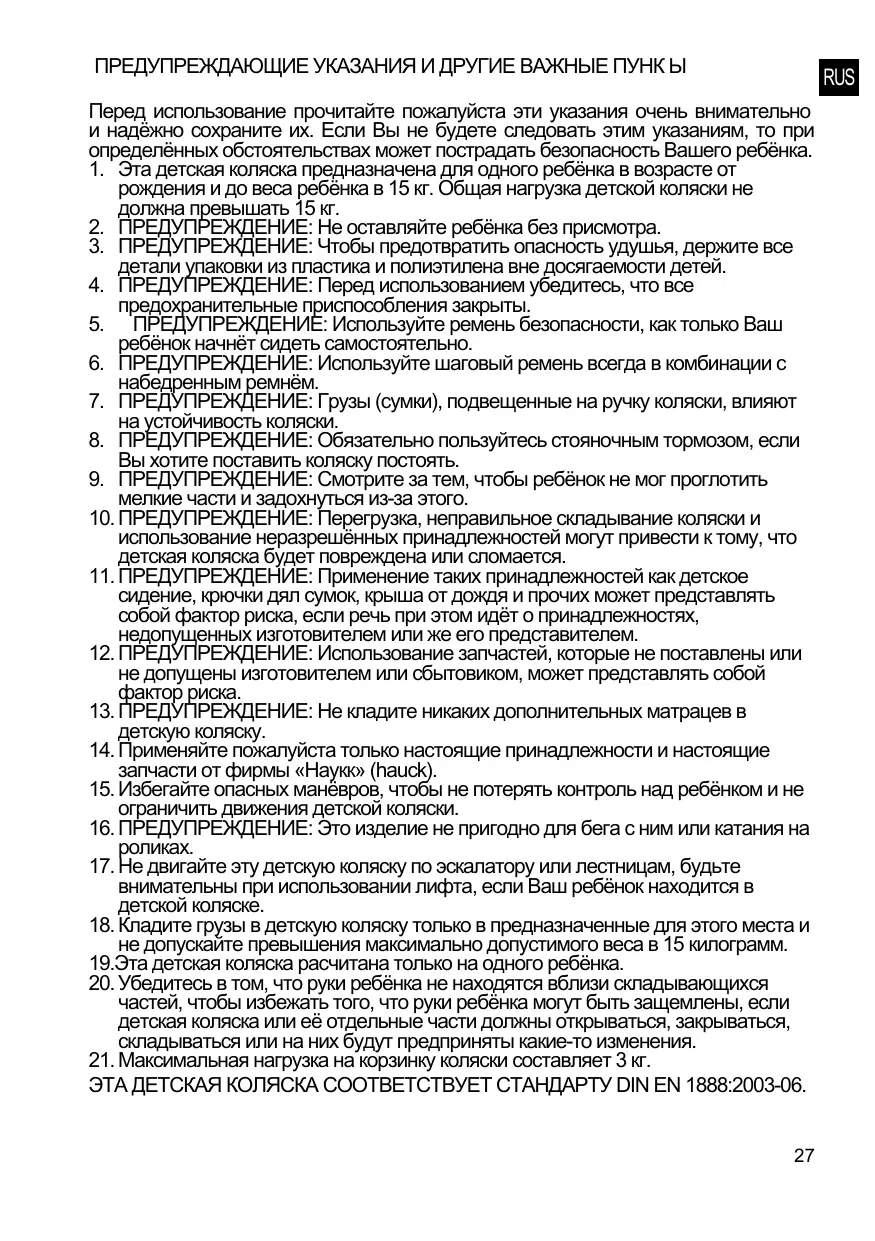 ПРЕДУПРЕЖДАЮЩИЕ УКАЗАНИЯ И ДРУГИЕ ВАЖНЫЕ ПУНК Ы RUS Перед использование прочитайте пожалуйста эти указания очень внимательно и надёжно сохраните их. Если Вы не будете следовать этим указаниям, то при определённых обстоятельствах может пострадать безопасность Вашего ребёнка.