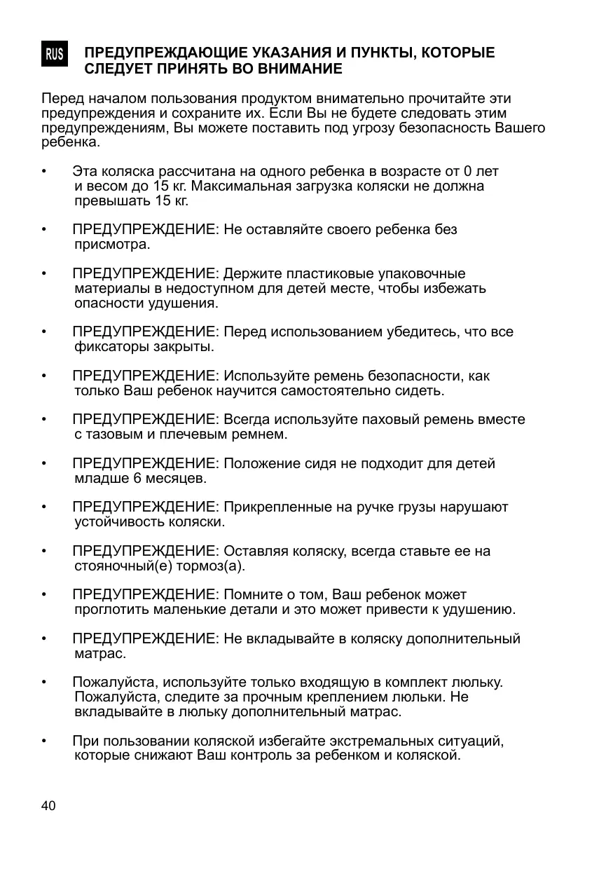 Cette poussette est destinée à un enfant à partir d’un âge de 0 mois et un poids maximum de 15 kg. La charge maximale de la poussette ne doit pas dépasser 15 kg.
