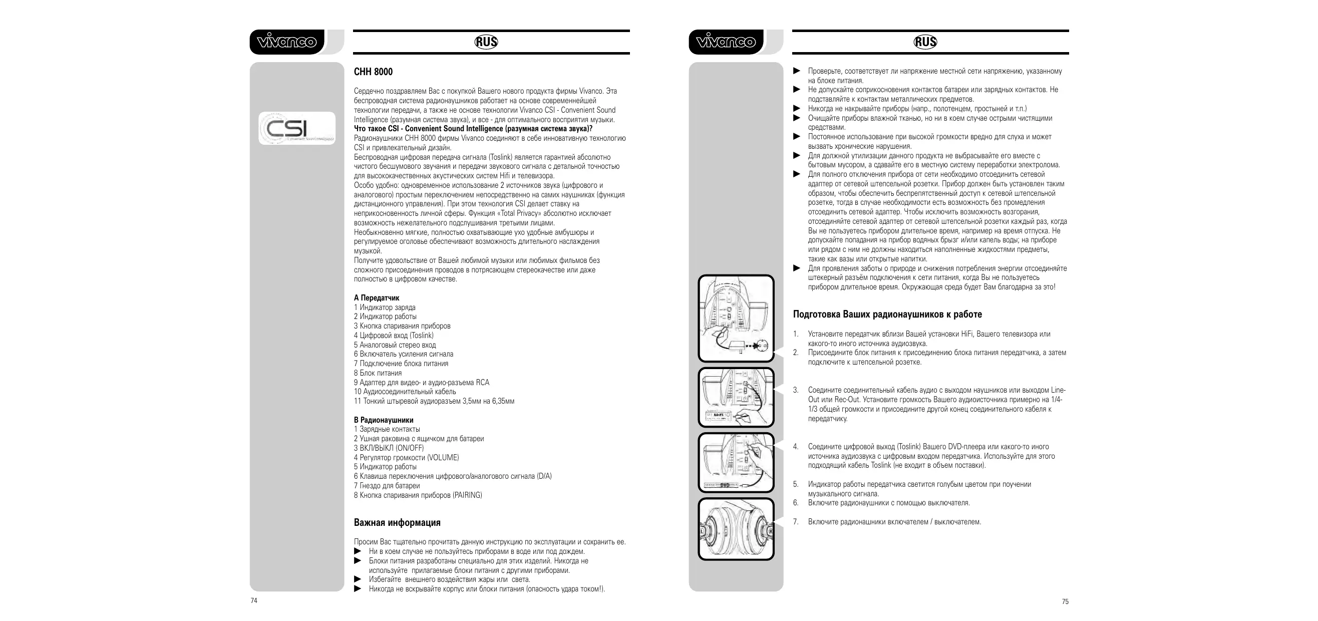 Сердечно поздравляем Вас с покупкой Вашего нового продукта фирмы Vivanco. Эта беспроводная система радионаушников работает на основе современнейшей технологии передачи, а также не основе технологии Vivanco CSI - Convenient Sound Intelligence (разумная система звука), и все - для оптимального восприятия музыки. Что такое CSI - Convenient Sound Intelligence (разумная система звука)? Радионаушники CHH 8000 фирмы Vivanco соединяют в себе инновативную технологию CSI и привлекательный дизайн. Беспроводная цифровая передача сигнала (Toslink) является гарантией абсолютно чистого бесшумового звучания и передачи звукового сигнала с детальной точностью для высококачественных акустических систем Hifi и телевизора. Особо удобно: одновременное использование 2 источников звука (цифрового и аналогового) простым переключением непосредственно на самих наушниках (функция дистанционного управления). При этом технология CSI делает ставку на неприкосновенность личной сферы. Функция «Total Privacy» абсолютно исключает возможность нежелательного подслушивания третьими лицами. Необыкновенно мягкие, полностью охватывающие ухо удобные амбушюры и регулируемое оголовье обеспечивают возможность длительного наслаждения музыкой. Получите удовольствие от Вашей любимой музыки или любимых фильмов без сложного присоединения проводов в потрясающем стереокачестве или даже полностью в цифровом качестве.