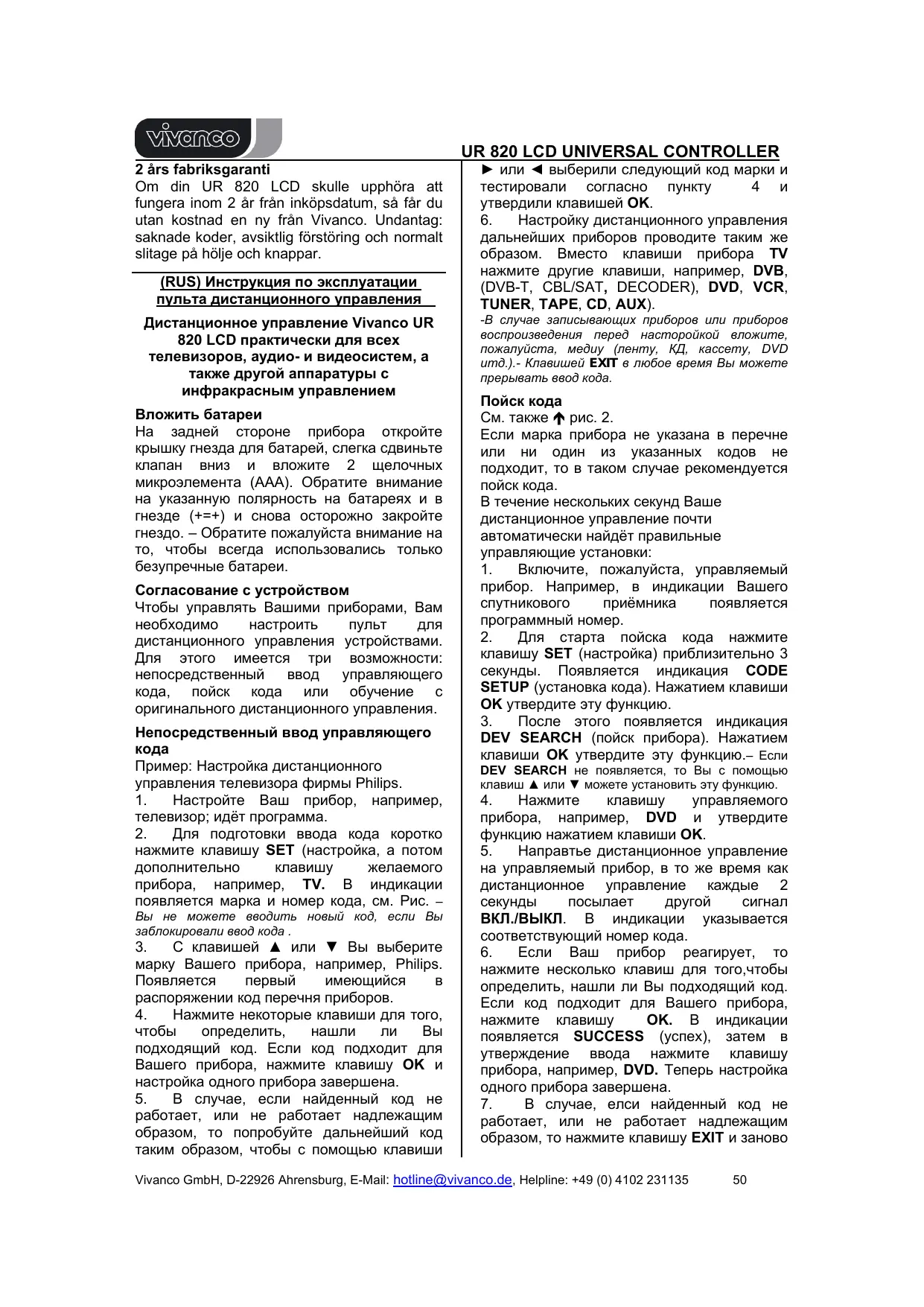 РУКОВОДСТВО ПОЛЬЗОВАТЕЛЯ UNIVERSAL CONTROLLER UR 820 LCD VIVANCO