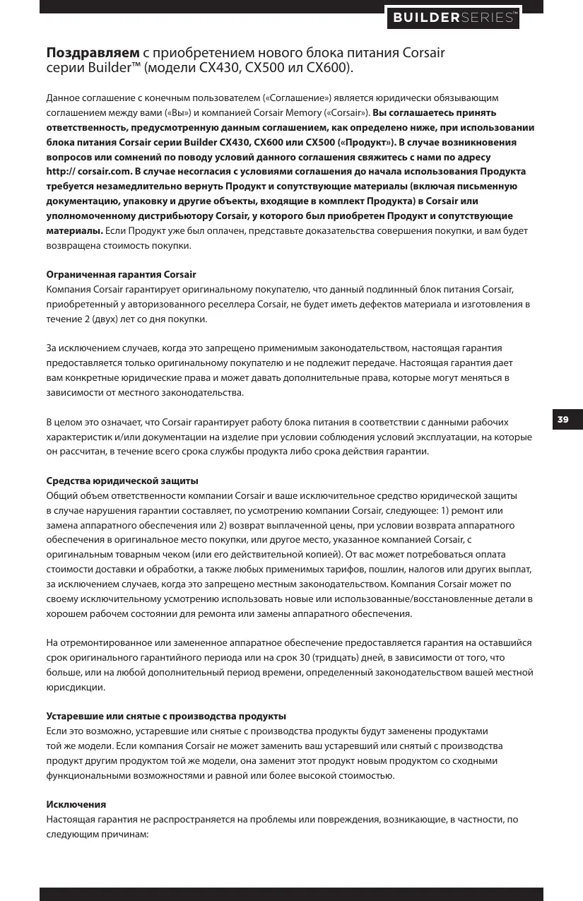 R 51318.22-99 R 51318.24-99 R 51317.3.2-2006 R 51317.3.3-99 ROHS 2002/95/EC, directiva sobre la restricción de sustancias peligrosas WEEE 2002/96/EC, directiva de residuos de aparatos eléctricos y electrónicos ROHS (China) Orden núm. 39 de China, administración del control de la contaminación producida por productos de información electrónicos BUILDERSERIES™ Поздравляем с приобретением нового блока питания Corsair серии Builder™ (модели CX430, CX500 ил CX600). Данное соглашение с конечным пользователем («Соглашение») является юридически обязывающим соглашением между вами («Вы») и компанией Corsair Memory («Corsair»). Вы соглашаетесь принять ответственность, предусмотренную данным соглашением, как определено ниже, при использовании блока питания Corsair серии Builder CX430, CX600 или CX500 («Продукт»). В случае возникновения вопросов или сомнений по поводу условий данного соглашения свяжитесь с нами по адресу http:// corsair.com. В случае несогласия с условиями соглашения до начала использования Продукта требуется незамедлительно вернуть Продукт и сопутствующие материалы (включая письменную документацию, упаковку и другие объекты, входящие в комплект Продукта) в Corsair или уполномоченному дистрибьютору Corsair, у которого был приобретен Продукт и сопутствующие материалы. Если Продукт уже был оплачен, представьте доказательства совершения покупки, и вам будет возвращена стоимость покупки. Ограниченная гарантия Corsair Компания Corsair гарантирует оригинальному покупателю, что данный подлинный блок питания Corsair, приобретенный у авторизованного реселлера Corsair, не будет иметь дефектов материала и изготовления в течение 2 (двух) лет со дня покупки. За исключением случаев, когда это запрещено применимым законодательством, настоящая гарантия предоставляется только оригинальному покупателю и не подлежит передаче. Настоящая гарантия дает вам конкретные юридические права и может давать дополнительные права, которые могут меняться в зависимости от местного законодательства. В целом это означает, что Corsair гарантирует работу блока питания в соответствии с данными рабочих характеристик и/или документации на изделие при условии соблюдения условий эксплуатации, на которые он рассчитан, в течение всего срока службы продукта либо срока действия гарантии. Средства юридической защиты Общий объем ответственности компании Corsair и ваше исключительное средство юридической защиты в случае нарушения гарантии составляет, по усмотрению компании Corsair, следующее: 1) ремонт или замена аппаратного обеспечения или 2) возврат выплаченной цены, при условии возврата аппаратного обеспечения в оригинальное место покупки, или другое место, указанное компанией Corsair, с оригинальным товарным чеком (или его действительной копией). От вас может потребоваться оплата стоимости доставки и обработки, а также любых применимых тарифов, пошлин, налогов или других выплат, за исключением случаев, когда это запрещено местным законодательством. Компания Corsair может по своему исключительному усмотрению использовать новые или использованные/восстановленные детали в хорошем рабочем состоянии для ремонта или замены аппаратного обеспечения. На отремонтированное или замененное аппаратное обеспечение предоставляется гарантия на оставшийся срок оригинального гарантийного периода или на срок 30 (тридцать) дней, в зависимости от того, что больше, или на любой дополнительный период времени, определенный законодательством вашей местной юрисдикции. Устаревшие или снятые с произ