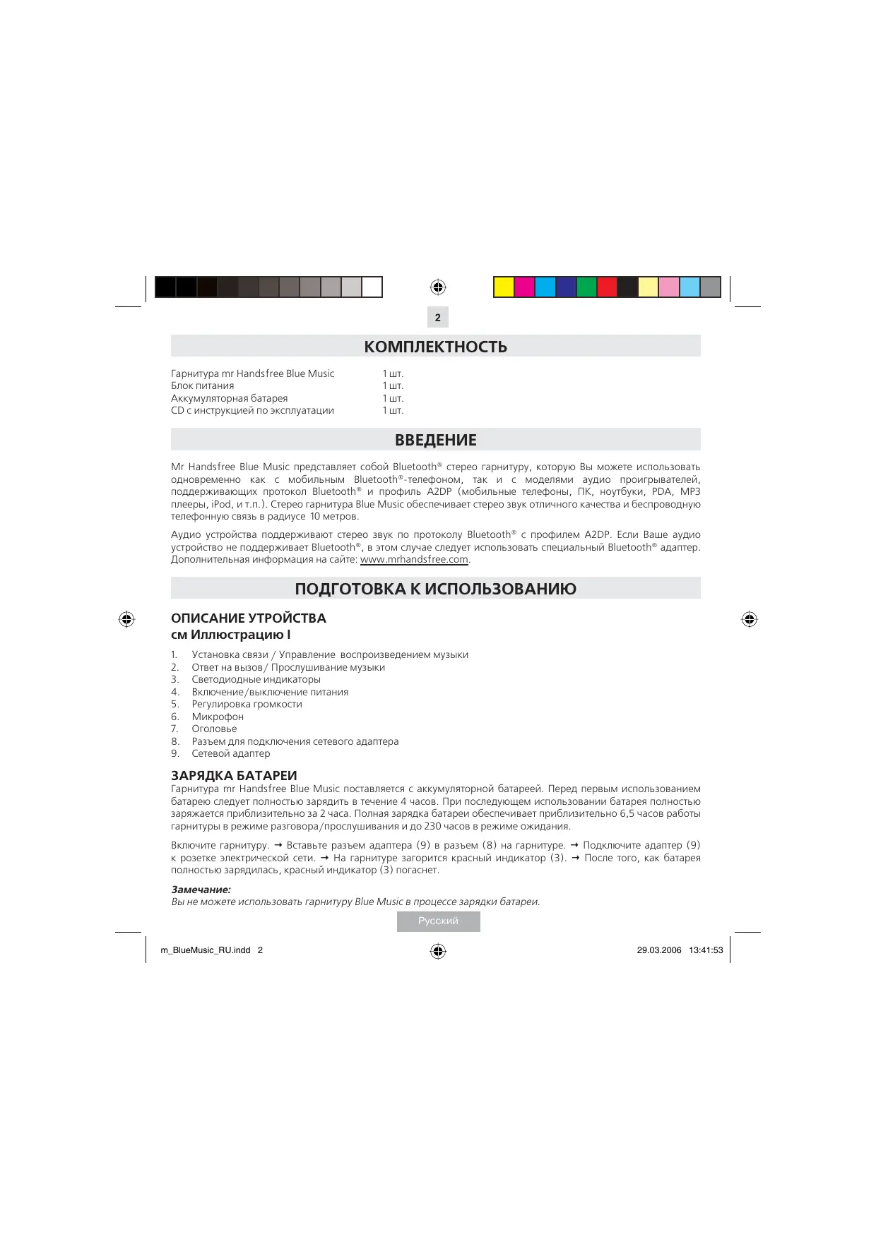 КОМПЛЕКТНОСТЬ Гарнитура mr Handsfree Blue Music Блок питания Аккумуляторная батарея CD с инструкцией по эксплуатации 1 шт. 1 шт. 1 шт. 1 шт.