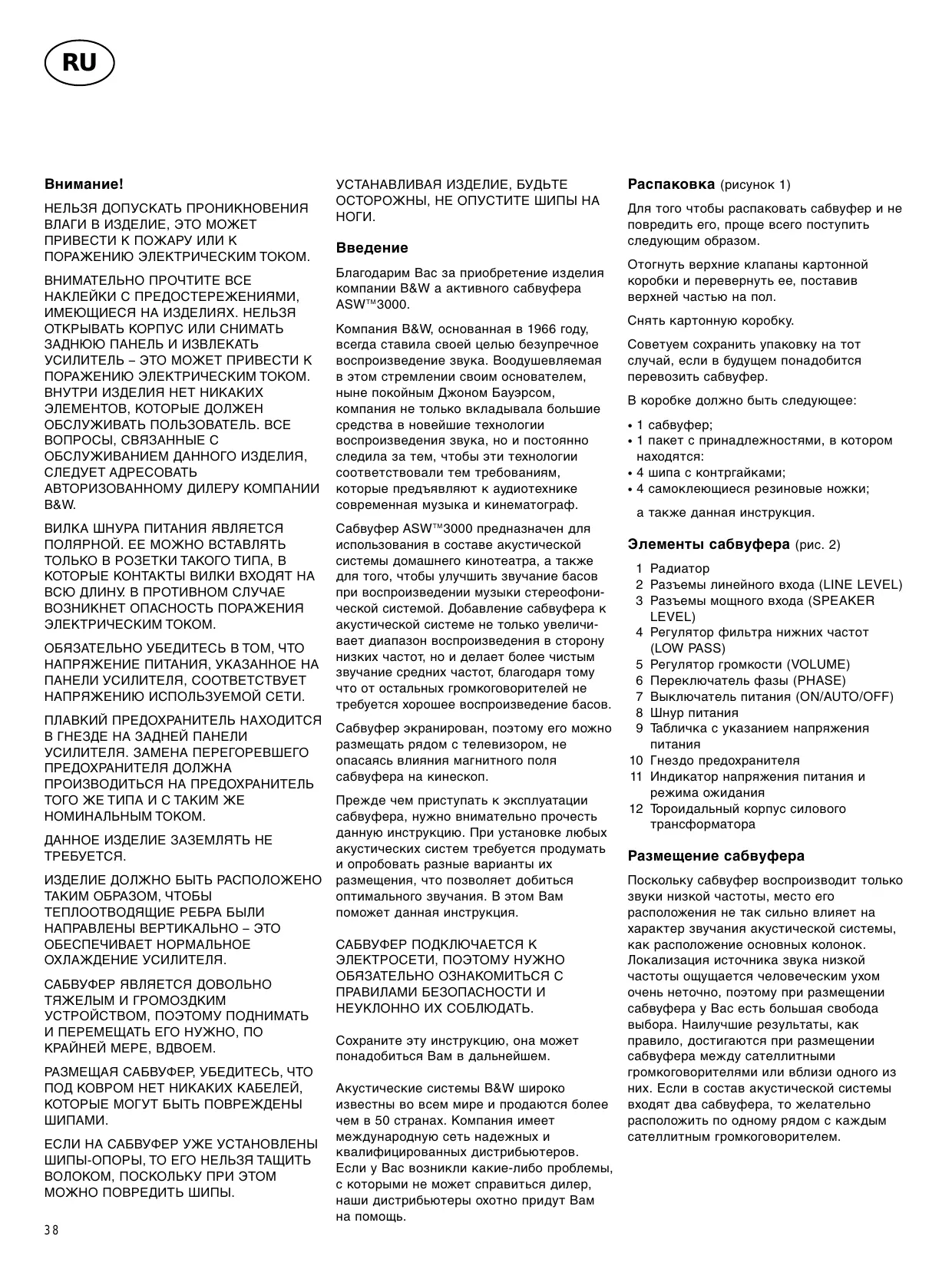 Введение Благодарим Вас за приобретение изделия компании B&W а активного сабвуфера ASW™3000. Компания B&W, основанная в 1966 году, всегда ставила своей целью безупречное воспроизведение звука. Воодушевляемая в этом стремлении своим основателем, ныне покойным Джоном Бауэрсом, компания не только вкладывала большие средства в новейшие технологии воспроизведения звука, но и постоянно следила за тем, чтобы эти технологии соответствовали тем требованиям, которые предъявляют к аудиотехнике современная музыка и кинематограф. Сабвуфер ASW™3000 предназначен для использования в составе акустической системы домашнего кинотеатра, а также для того, чтобы улучшить звучание басов при воспроизведении музыки стереофонической системой. Добавление сабвуфера к акустической системе не только увеличивает диапазон воспроизведения в сторону низких частот, но и делает более чистым звучание средних частот, благодаря тому что от остальных громкоговорителей не требуется хорошее воспроизведение басов. Сабвуфер экранирован, поэтому его можно размещать рядом с телевизором, не опасаясь влияния магнитного поля сабвуфера на кинескоп. Прежде чем приступать к эксплуатации сабвуфера, нужно внимательно прочесть данную инструкцию. При установке любых акустических систем требуется продумать и опробовать разные варианты их размещения, что позволяет добиться оптимального звучания. В этом Вам поможет данная инструкция. САБВУФЕР ПОДКЛЮЧАЕТСЯ К ЭЛЕКТРОСЕТИ, ПОЭТОМУ НУЖНО ОБЯЗАТЕЛЬНО ОЗНАКОМИТЬСЯ С ПРАВИЛАМИ БЕЗОПАСНОСТИ И НЕУКЛОННО ИХ СОБЛЮДАТЬ. Сохраните эту инструкцию, она может понадобиться Вам в дальнейшем. Акустические системы B&W широко известны во всем мире и продаются более чем в 50 странах. Компания имеет международную сеть надежных и квалифицированных дистрибьютеров. Если у Вас возникли какие-либо проблемы, с которыми не может справиться дилер, наши дистрибьютеры охотно придут Вам на помощь.