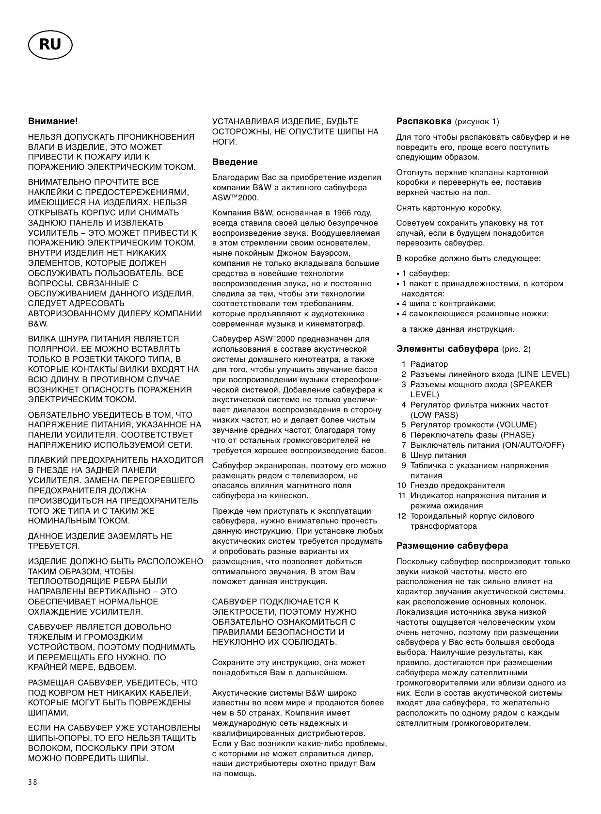 Введение Благодарим Вас за приобретение изделия компании B&W а активного сабвуфера ASW™2000. Компания B&W, основанная в 1966 году, всегда ставила своей целью безупречное воспроизведение звука. Воодушевляемая в этом стремлении своим основателем, ныне покойным Джоном Бауэрсом, компания не только вкладывала большие средства в новейшие технологии воспроизведения звука, но и постоянно следила за тем, чтобы эти технологии соответствовали тем требованиям, которые предъявляют к аудиотехнике современная музыка и кинематограф. Сабвуфер ASW™2000 предназначен для использования в составе акустической системы домашнего кинотеатра, а также для того, чтобы улучшить звучание басов при воспроизведении музыки стереофонической системой. Добавление сабвуфера к акустической системе не только увеличивает диапазон воспроизведения в сторону низких частот, но и делает более чистым звучание средних частот, благодаря тому что от остальных громкоговорителей не требуется хорошее воспроизведение басов. Сабвуфер экранирован, поэтому его можно размещать рядом с телевизором, не опасаясь влияния магнитного поля сабвуфера на кинескоп. Прежде чем приступать к эксплуатации сабвуфера, нужно внимательно прочесть данную инструкцию. При установке любых акустических систем требуется продумать и опробовать разные варианты их размещения, что позволяет добиться оптимального звучания. В этом Вам поможет данная инструкция. САБВУФЕР ПОДКЛЮЧАЕТСЯ К ЭЛЕКТРОСЕТИ, ПОЭТОМУ НУЖНО ОБЯЗАТЕЛЬНО ОЗНАКОМИТЬСЯ С ПРАВИЛАМИ БЕЗОПАСНОСТИ И НЕУКЛОННО ИХ СОБЛЮДАТЬ. Сохраните эту инструкцию, она может понадобиться Вам в дальнейшем. Акустические системы B&W широко известны во всем мире и продаются более чем в 50 странах. Компания имеет международную сеть надежных и квалифицированных дистрибьютеров. Если у Вас возникли какие-либо проблемы, с которыми не может справиться дилер, наши дистрибьютеры охотно придут Вам на помощь.