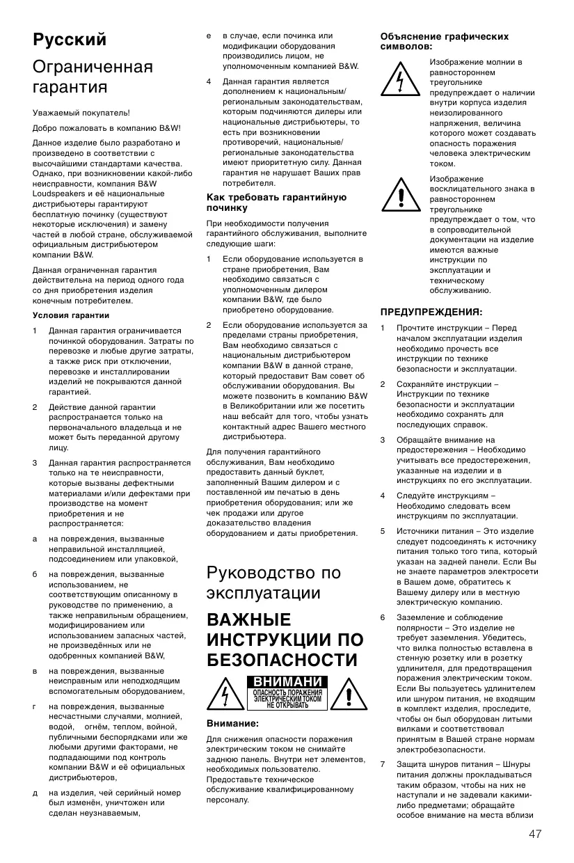на повреждения, вызванные неисправным или неподходящим вспомогательным оборудованием, на повреждения, вызванные несчастными случаями, молнией, водой, огнём, теплом, войной, публичными беспорядками или же любыми другими факторами, не подпадающими под контроль компании B&W и её официальных дистрибьютеров, на изделия, чей серийный номер был изменён, уничтожен или сделан неузнаваемым, Изображение восклицательного знака в равностороннем треугольнике предупреждает о том, что в сопроводительной документации на изделие имеются важные инструкции по эксплуатации и техническому обслуживанию. При необходимости получения гарантийного обслуживания, выполните следующие шаги: