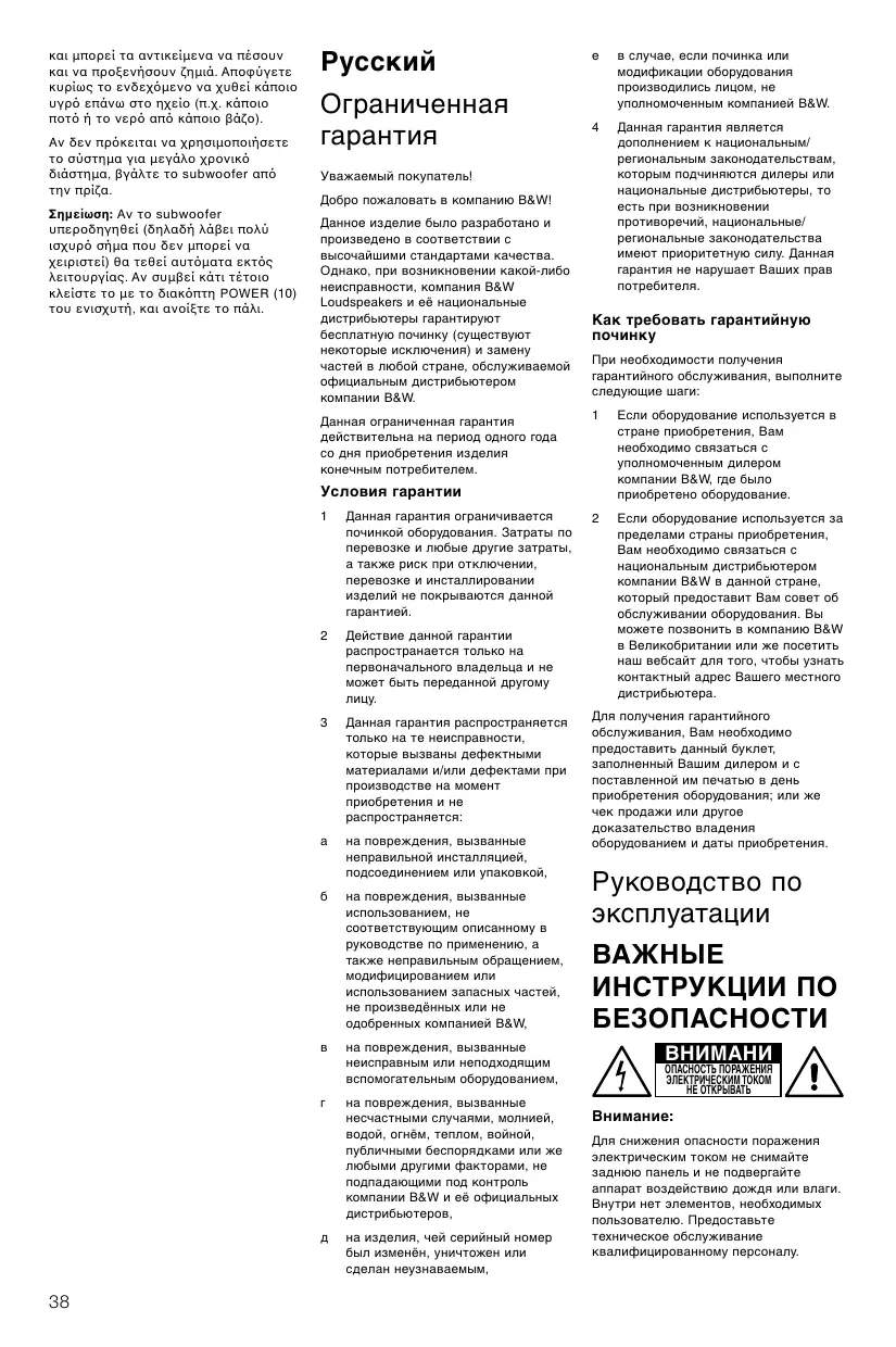 Уважаемый покупатель! Добро пожаловать в компанию B&W! Данное изделие было разработано и произведено в соответствии с высочайшими стандартами качества. Однако, при возникновении какой-либо неисправности, компания B&W Loudspeakers и её национальные дистрибьютеры гарантируют бесплатную починку (существуют некоторые исключения) и замену частей в любой стране, обслуживаемой официальным дистрибьютером компании B&W. Данная ограниченная гарантия действительна на период одного года со дня приобретения изделия конечным потребителем.