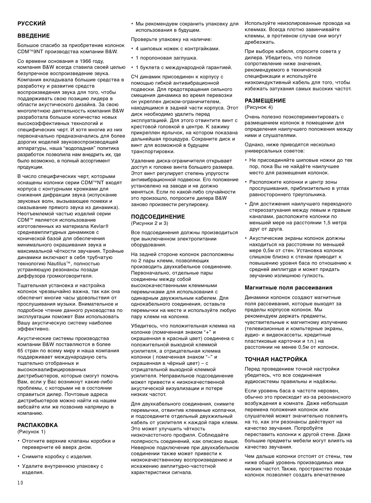 Большое спасибо за приобретение колонок CDM™9NT производства компании B&W. Со времени основания в 1966 году, компания B&W всегда ставила своей целью безупречное воспроизведение звука. Компания вкладывала большие средства в разработку и развитие средств воспроизведения звука для того, чтобы поддерживать свою позицию лидера в области акустического дизайна. За свою многолетнюю деятельность компания B&W разработала большое количество новых высокоэффективных технологий и специфических черт. И хотя многие из них первоначально предназначались для более дорогих моделей звуковоспроизводящей аппаратуры, наша “водопадная” политика разработок позволила нам внедрить их, где было возможно, в полный ассортимент В число специфических черт, которыми оснащены колонки серии CDM™NT входят корпуса с контурными кромками для снижения дифракции звука (испускание звуковых волн, вызывающее помехи и смазывание прямого звука из динамика). Неотъемлемой частью изделий серии CDM™ является использование изготовленных из материала Kevlar® среднеамплитудных динамиков с конической базой для обеспечения минимального окрашивания звука и максимальной чёткости звучания. Тройные динамики включают в себя трубчатую технологию Nautilus™, полностью устраняющую резонансы позади диффузора громкоговорителя. Тщательная установка и настройка колонок чрезвычайно важна, так как она обеспечит многие часы удовольствия от прослушивания музыки. Внимательное и подробное чтение данного руководства по эксплуатации поможет Вам использовать Вашу акустическую систему наиболее эффективно. Акустические системы производства компании B&W поставляются в более 65 стран по всему миру и наша компания поддерживает международную сеть тщательно отобранных и высококвалифицированных дистрибьютеров, которые смогут помочь Вам, если у Вас возникнут какие-либо проблемы, с которыми не в состоянии справиться дилер. Почтовые адреса дистрибьютеров можно найти на нашем вебсайте или же позвонив напрямую в