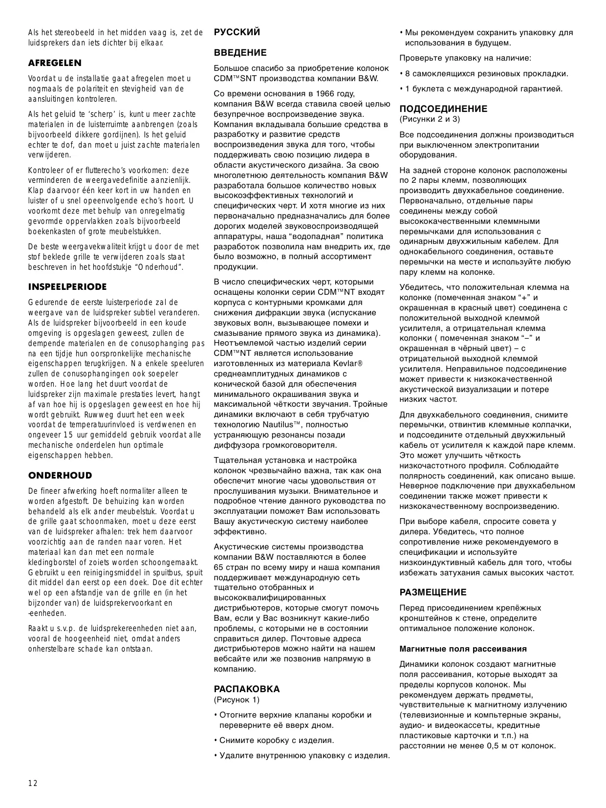 Большое спасибо за приобретение колонок CDM™SNT производства компании B&W. Со времени основания в 1966 году, компания B&W всегда ставила своей целью безупречное воспроизведение звука. Компания вкладывала большие средства в разработку и развитие средств воспроизведения звука для того, чтобы поддерживать свою позицию лидера в области акустического дизайна. За свою многолетнюю деятельность компания B&W разработала большое количество новых высокоэффективных технологий и специфических черт. И хотя многие из них первоначально предназначались для более дорогих моделей звуковоспроизводящей аппаратуры, наша “водопадная” политика разработок позволила нам внедрить их, где было возможно, в полный ассортимент продукции. В число специфических черт, которыми оснащены колонки серии CDM™NT входят корпуса с контурными кромками для снижения дифракции звука (испускание звуковых волн, вызывающее помехи и смазывание прямого звука из динамика). Неотъемлемой частью изделий серии CDM™NT является использование изготовленных из материала Kevlar® среднеамплитудных динамиков с конической базой для обеспечения минимального окрашивания звука и максимальной чёткости звучания. Тройные динамики включают в себя трубчатую технологию Nautilus™, полностью устраняющую резонансы позади диффузора громкоговорителя. Тщательная установка и настройка колонок чрезвычайно важна, так как она обеспечит многие часы удовольствия от прослушивания музыки. Внимательное и подробное чтение данного руководства по эксплуатации поможет Вам использовать Вашу акустическую систему наиболее эффективно. Акустические системы производства компании B&W поставляются в более 65 стран по всему миру и наша компания поддерживает международную сеть тщательно отобранных и высококвалифицированных дистрибьютеров, которые смогут помочь Вам, если у Вас возникнут какие-либо проблемы, с которыми не в состоянии справиться дилер. Почтовые адреса дистрибьютеров можно найти на нашем вебсайте или же позвонив напрямую в компанию.