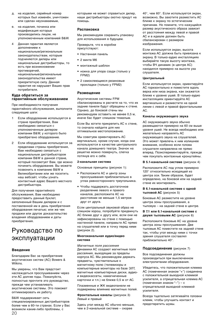 Руководство по эксплуатации Введение Благодарим Вас за приобретение акустических систем (АС) Bowers & Wilkins. Мы уверены, что Вам предстоит наслаждаться прослушиванием через эти АС долгие годы. Пожалуйста, полностью прочтите это руководство, прежде чем устанавливать акустические системы. Это поможет оптимизировать их работу. B&W поддерживает сеть специализированных дистрибьюторов более чем в 60-ти странах. Если у Вас возникли какие-либо проблемы, с