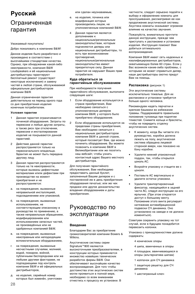 Уважаемый покупатель! Добро пожаловать в компанию B&W! Данное изделие было разработано и произведено в соответствии с высочайшими стандартами качества. Однако, при обнаружении какой-либо неисправности, компания B&W Loudspeakers и её национальные дистрибьюторы гарантируют бесплатный ремонт (существуют некоторые исключения) и замену частей в любой стране, обслуживаемой официальным дистрибьютором компании B&W. Данная ограниченная гарантия действительна на период одного года со дня приобретения изделия конечным потребителем.