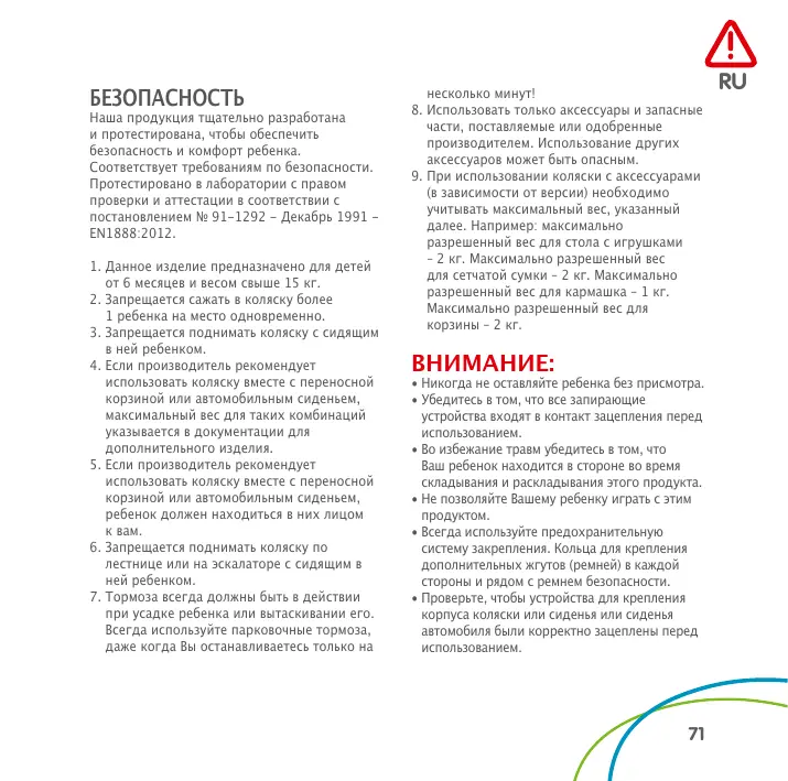 Наша продукция тщательно разработана и протестирована, чтобы обеспечить безопасность и комфорт ребенка. Соответствует требованиям по безопасности. Протестировано в лаборатории с правом проверки и аттестации в соответствии с постановлением № 91-1292 - Декабрь 1991 EN1888:2012. 1. Данное изделие предназначено для детей от 6 месяцев и весом свыше 15 кг. 2. Запрещается сажать в коляску более 1 ребенка на место одновременно. 3. Запрещается поднимать коляску с сидящим в ней ребенком. 4. Если производитель рекомендует использовать коляску вместе с переносной корзиной или автомобильным сиденьем, максимальный вес для таких комбинаций указывается в документации для дополнительного изделия. 5. Если производитель рекомендует использовать коляску вместе с переносной корзиной или автомобильным сиденьем, ребенок должен находиться в них лицом к вам. 6. Запрещается поднимать коляску по лестнице или на эскалаторе с сидящим в ней ребенком. 7. Тормоза всегда должны быть в действии при усадке ребенка или вытаскивании его. Всегда используйте парковочные тормоза, даже когда Вы останавливаетесь только на