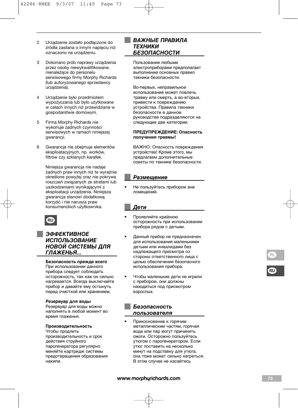 Все изделияMorphyRichardsперед отправкой с завода проходят индивидуальную проверку. Гарантийный срок начинается со дня покупки и действует в течение 24 месяцев (2 года). Подтверждением права на гарантийное обслуживание является предоставление покупателем чека на покупку и гарантийного талона, заполненного и подписанного продавцом. Серийный номер прибора должен соответствовать номеру, указанному в гарантийном талоне. В течение гарантийного срока осуществляется гарантийная замена (если неисправность допущена по вине заводаизготовителя). Если по каким-либо причинам в течение двухлетнего гарантийногопериода данное изделие было заменено новым, гарантия на новое изделие будет исчисляться с момента первоначальнойпокупки прибора. В связи с этим, очень важно сохранять квитанцию или счетфактуру, подтверждающие дату первоначальной покупки. Двухлетняя гарантия распространяется только на те изделия, которые эксплуатируются в соответствии с указаниями производителя. Например, изделия должны очищаться от накипи,фильтры должны поддерживаться в чистом состоянии.