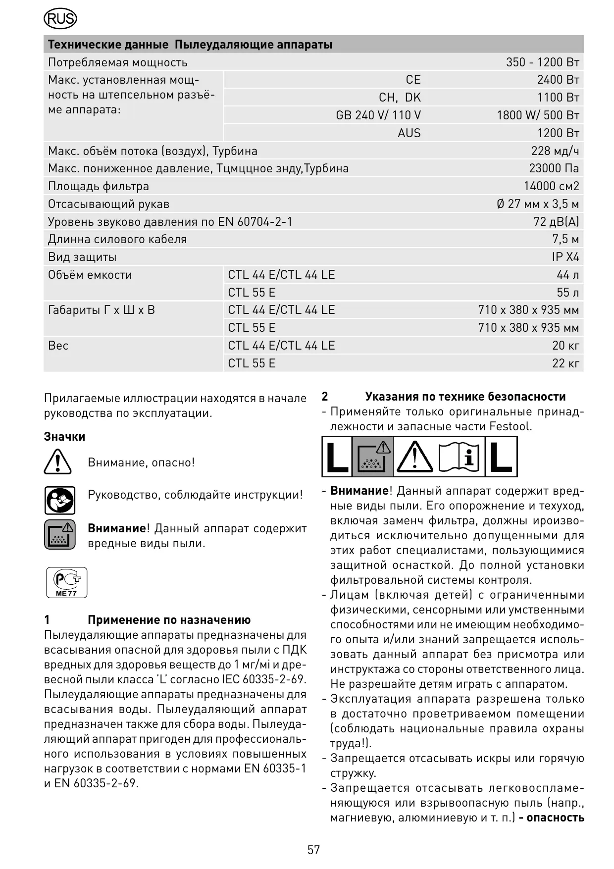Указания по технике безопасности - Применяйте только оригинальные принадлежности и запасные части Festool. Прилагаемые иллюстрации находятся в начале руководства по эксплуатации. Внимание, опасно! - Внимание! Данный аппарат содержит вредные виды пыли. Его опорожнение и техуход, включая заменч фильтра, должны ироизводиться исключительно допущенными для этих работ специалистами, пользующимися защитной оснасткой. До полной установки фильтровальной системы контроля. - Лицам (включая детей) с ограниченными физическими, сенсорными или умственными способностями или не имеющим необходимого опыта и/или знаний запрещается использовать данный аппарат без присмотра или инструктажа со стороны ответственного лица. Не разрешайте детям играть с аппаратом. - Эксплуатация аппарата разрешена только в достаточно проветриваемом помещении (соблюдать национальные правила охраны - Запрещается отсасывать искры или горячую - Запрещается отсасывать легковоспламеняющуюся или взрывоопасную пыль (напр., магниевую, алюминиевую и т. п.) - опасность Руководство, соблюдайте инструкции! Внимание! Данный аппарат содержит вредные виды пыли. ME 77