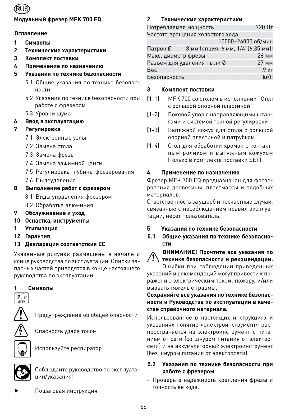 Применение по назначению Фрезер MFK 700 EQ предназначен для фрезерования древесины, пластмассы и подобных материалов. Ответственность за ущерб и несчастные случаи, связанные с несоблюдением правил эксплуатации, несет пользователь. Указанные рисунки размещены в начале и конце руководства по эксплуатации. Списки запасных частей приводятся в конце настоящего руководства по эксплуатации.