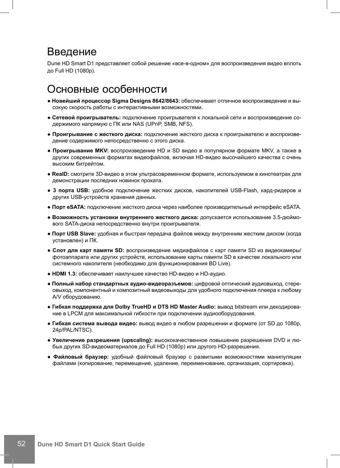 Dune HD Smart D1 Quick Start Guide Подключение USB-накопителей Для подключения USB-накопителя убедитесь, что вы находитесь на главном экране меню проигрывателя, и подключите USB-накопитель к одному из USB-портов проигрывателя. Проигрыватель распознает накопитель, и на главном экране появится соответствующий USB-накопителю элемент. При подключении USB-накопителя, которому требуется существенная мощность по питанию (например, жесткий диск), используйте внешний блок питания для USB-накопителя. Питание, которое предоставляет проигрыватель для USB-портов, может оказаться недостаточным для корректного функционирования USB-диска. Не отсоединяйте и не выключайте USB-накопитель во время операций записи на него. Использование карт памяти SD Перед подключением карты памяти SD, убедитесь, что вы находитесь в главном меню проигрывателя, и после этого вставьте карту памяти в слот для карт памяти SD на передней панели проигрывателя. Проигрыватель распознает вставленную карту памяти, и на главном экране появится соответствующий карте памяти элемент. Некоторые карты памяти SD могут не распознаваться плеером или работать некорректно; в таком случае, используйте другие модели карт памяти. Не извлекайте карту памяти SD из слота во время операций записи на нее. Подключение eSATA-накопителей Для того, чтобы подключить eSATA-накопитель, выключите и проигрыватель, и накопитель, произведите подключение eSATA-накопителя к eSATA-порту (и подключите eSATA-накопитель к его источнику питания), включите eSATA-накопитель, и, в последнюю очередь, включите проигрыватель. Проигрыватель распознает eSATA-накопитель на главном экране появится соответствующий eSATA-накопителю элемент. Выключайте и отсоединяйте eSATA-накопитель только после выключения проигрывателя. Использование интерфейса USB Slave Перед подключением проигрывателя с установленным внутрь HDD через интерфейс USB Slave, выключите питание плеера, затем соедините его кабелем USB с ПК. После этого включите проигрыватель. Персональный компьютер определит новое USB-устройство. По окончании работы плеером на ПК, произведите процедуру «безопасного извлечения устройства» на компьютере, выключите питание проигрывателя и только после этого отсоедините кабель USB от обоих устройств. Доступ к сетевым дискам Для подключения сетевого диска по протоколу SMB или NFS, убедитесь, что вы находитесь на главном экране меню проигрывателя, нажмите кнопку пульта «MENU» и выберите пункт «Создать сетевую папку», затем введите требуемые параметры сетевого диска. Проигрыватель будет показывать элемент, соответствующий этому сетевому диску, на главном экране. Для просмотра списка доступных сетевых ресурсов по протоколу SMB или UPnP, воспользуйтесь элементом «Браузер сети» на главном экране меню проигрывателя. ПРИМЕЧАНИЕ: Если какието сетевые ресурсы не показываются проигрывателем, может потребоваться подождать несколько минут и повторить попытку (либо нажать кнопку пульта «MENU» и выбрать команду «Обновить»). Форматирование жесткого диска Для форматирования подключенного к проигрывателю HDD выберите соответствующую иконку в главном меню проигрывателя, нажмите кнопку «INFO» на ПДУ и выберите элемент «Форматирование диска» (для того, чтобы отформатировать весь диск) или «Форматирование раздела» (чтобы отформатировать уже существующий раздел). Проигрыватель произведет форматир