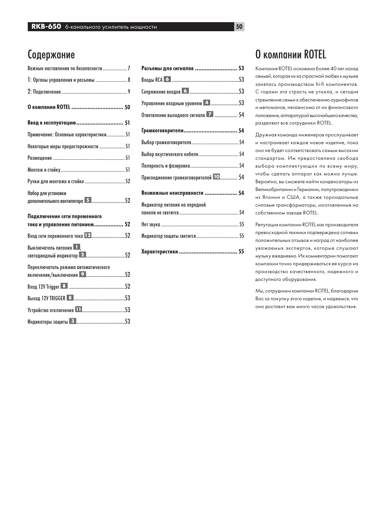 Компания ROTEL основана более 40 лет назад семьей, которая из-за страстной любви к музыке занялась производством hi-fi компонентов. С годами эта страсть не утихла, и сегодня стремление семьи к обеспечению аудиофилов и меломанов, независимо от их финансового положения, аппаратурой высочайшего качества, разделяют все сотрудники ROTEL. Дружная команда инженеров прослушивает и настраивает каждое новое изделие, пока оно не будет соответствовать самым высоким стандартам. Им предоставлена свобода выбора комплект ующих по всему миру, чтобы сделать аппарат как можно лучше. Вероятно, вы сможете найти конденсаторы из Великобритании и Германии, полупроводники из Японии и США, а также тороидальные силовые трансформаторы, изготовленные на собственном заводе ROTEL. Репутация компании ROTEL как производителя превосходной техники подтверждена сотнями положительных отзывов и наград от наиболее уважаемых экспертов, которые слушают музыку ежедневно. Их комментарии помогают компании точно придерживаться ее курса на производство качественного, надежного и доступного оборудования. Мы, сотрудники компании ROTEL, благодарим Вас за покупку этого изделия, и надеемся, что оно доставит вам много часов удовольствия.