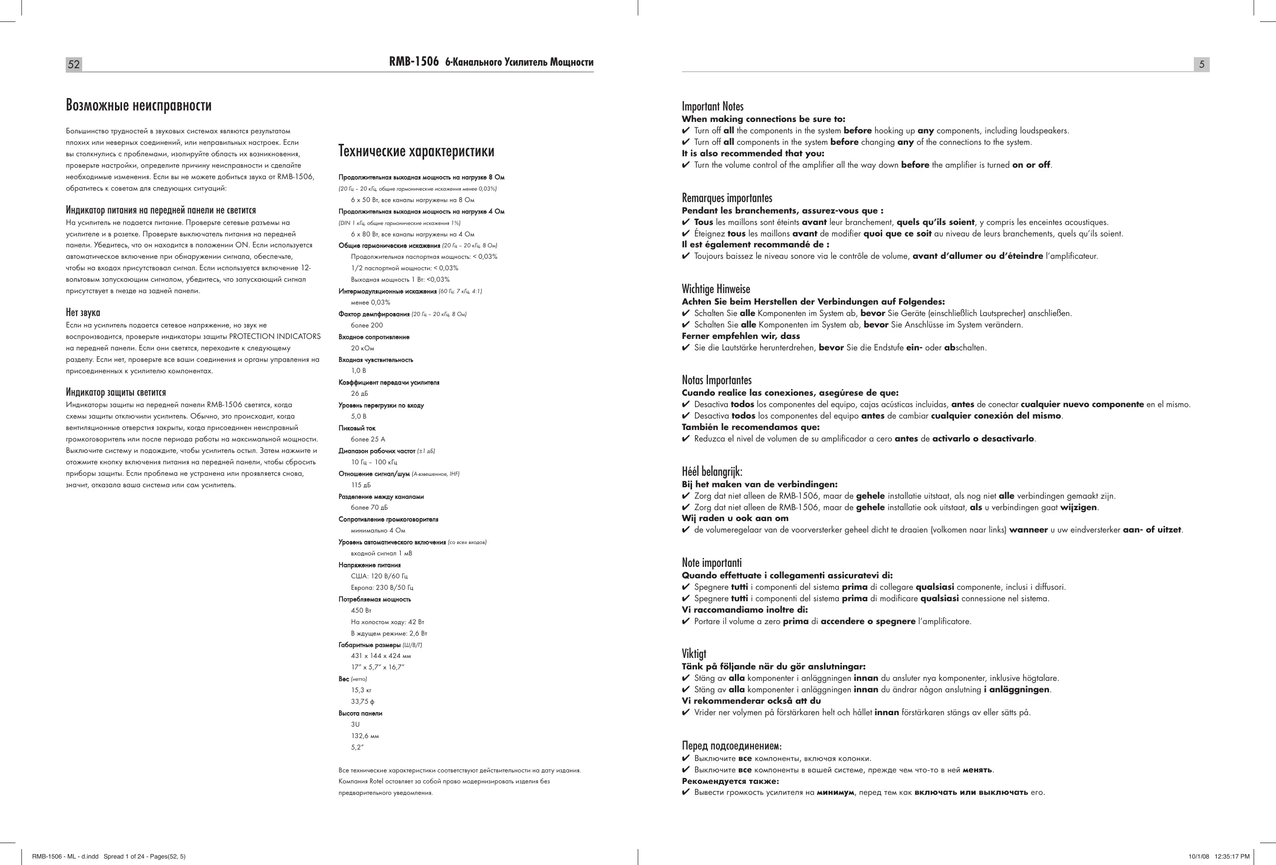 Возможные неисправности Большинство трудностей в звуковых системах являются результатом плохих или неверных соединений, или неправильных настроек. Если вы столкнулись с проблемами, изолируйте область их возникновения, проверьте настройки, определите причину неисправности и сделайте необходимые изменения. Если вы не можете добиться звука от RMB-1506, обратитесь к советам для следующих ситуаций: Important Notes Технические характеристики На усилитель не подается питание. Проверьте сетевые разъемы на усилителе и в розетке. Проверьте выключатель питания на передней панели. Убедитесь, что он находится в положении ON. Если используется автоматическое включение при обнаружении сигнала, обеспечьте, чтобы на входах присутствовал сигнал. Если используется включение 12вольтовым запускающим сигналом, убедитесь, что запускающий сигнал присутствует в гнезде на задней панели. (20 Гц – 20 кГц, общие гармонические искажения менее 0,03%) Продолжительная выходная мощность на нагрузке 4 Ом (DIN 1 кГц, общие гармонические искажения 1%) 6 x 80 Вт, все каналы нагружены на 4 Ом Общие гармонические искажения (20 Гц – 20 кГц, 8 Ом) Продолжительная паспортная мощность: < 0,03% Если на усилитель подается сетевое напряжение, но звук не воспроизводится, проверьте индикаторы защиты PROTECTION INDICATORS на передней панели. Если они светятся, переходите к следующему разделу. Если нет, проверьте все ваши соединения и органы управления на присоединенных к усилителю компонентах. Выходная мощность 1 Вт: <0,03% Интермодуляционные искажения (60 Гц: 7 кГц, 4:1) Фактор демпфирования (20 Гц – 20 кГц, 8 Ом) более 200 Входное сопротивление Индикаторы защиты на передней панели RMB-1506 светятся, когда схемы защиты отключили усилитель. Обычно, это происходит, когда вентиляционные отверстия закрыты, когда присоединен неисправный громкоговоритель или после периода работы на максимальной мощности. Выключите систему и подождите, чтобы усилитель остыл. Затем нажмите и отожмите кнопку включения питания на передней панели, чтобы сбросить приборы защиты. Если проблема не устранена или проявляется снова, значит, отказала ваша система или сам усилитель. Pendant les branchements, assurez-vous que : ✔ Tous les maillons sont éteints avant leur branchement, quels qu’ils soient, y compris les enceintes acoustiques. ✔ Éteignez tous les maillons avant de modifier quoi que ce soit au niveau de leurs branchements, quels qu’ils soient. Il est également recommandé de : ✔ Toujours baissez le niveau sonore via le contrôle de volume, avant d’allumer ou d’éteindre l’amplificateur. 20 кОм Wichtige Hinweise Achten Sie beim Herstellen der Verbindungen auf Folgendes: ✔ Schalten Sie alle Komponenten im System ab, bevor Sie Geräte (einschließlich Lautsprecher) anschließen. ✔ Schalten Sie alle Komponenten im System ab, bevor Sie Anschlüsse im System verändern. Ferner empfehlen wir, dass ✔ Sie die Lautstärke herunterdrehen, bevor Sie die Endstufe ein- oder abschalten. Входная чувствительность 1,0 В Коэффициент передачи усилителя Индикатор защиты светится Remarques importantes 1/2 паспортной мощности: < 0,03% менее 0,03%